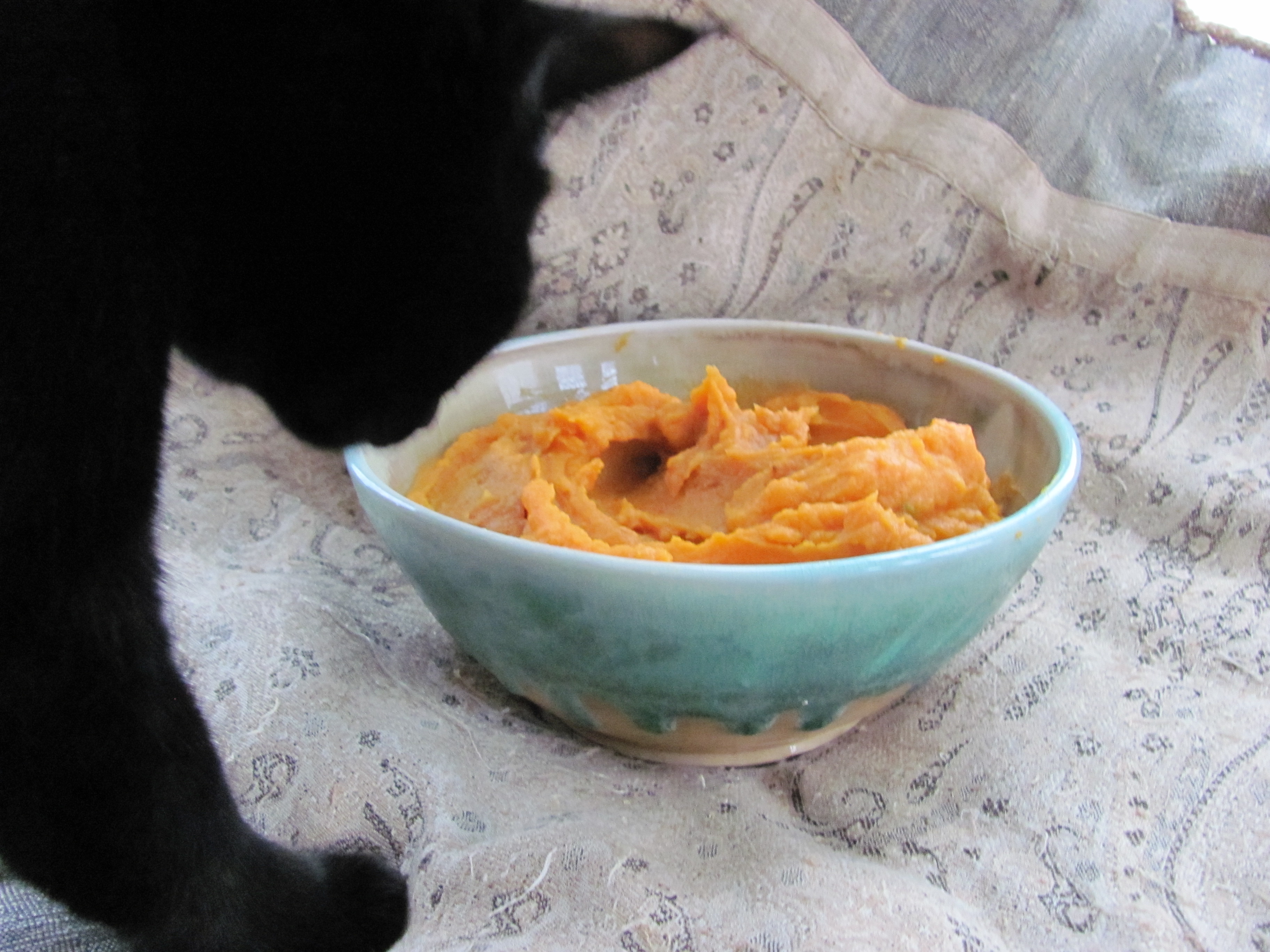 Wash several sweet potatoes. Peel a butternut squash, take out the innards, and cut it into chunks. Toss with salt and pepper and a bit of oil of your choice. Roast both. Use whatever oven temp you already have going from all your other cooking escapades. Take them out when they are soft. Scoop the flesh out of the sweets when they are cool enough to handle. Pop everything into a food processor. Process in batches if necessary. These are things you may add for flavor: butter, maple syrup, brown sugar, salt and pepper. If you like spices, go for cinnamon, nutmeg, cayenne and/or cumin. If you need a bit of moisture to loosen (depending on how dry your veggies are to start),  your options are milk, cream, stock, coconut or almond milk or even water. And if you want some crunch, you could top with some toasted nuts. Almonds, pecans, or walnuts are nice!