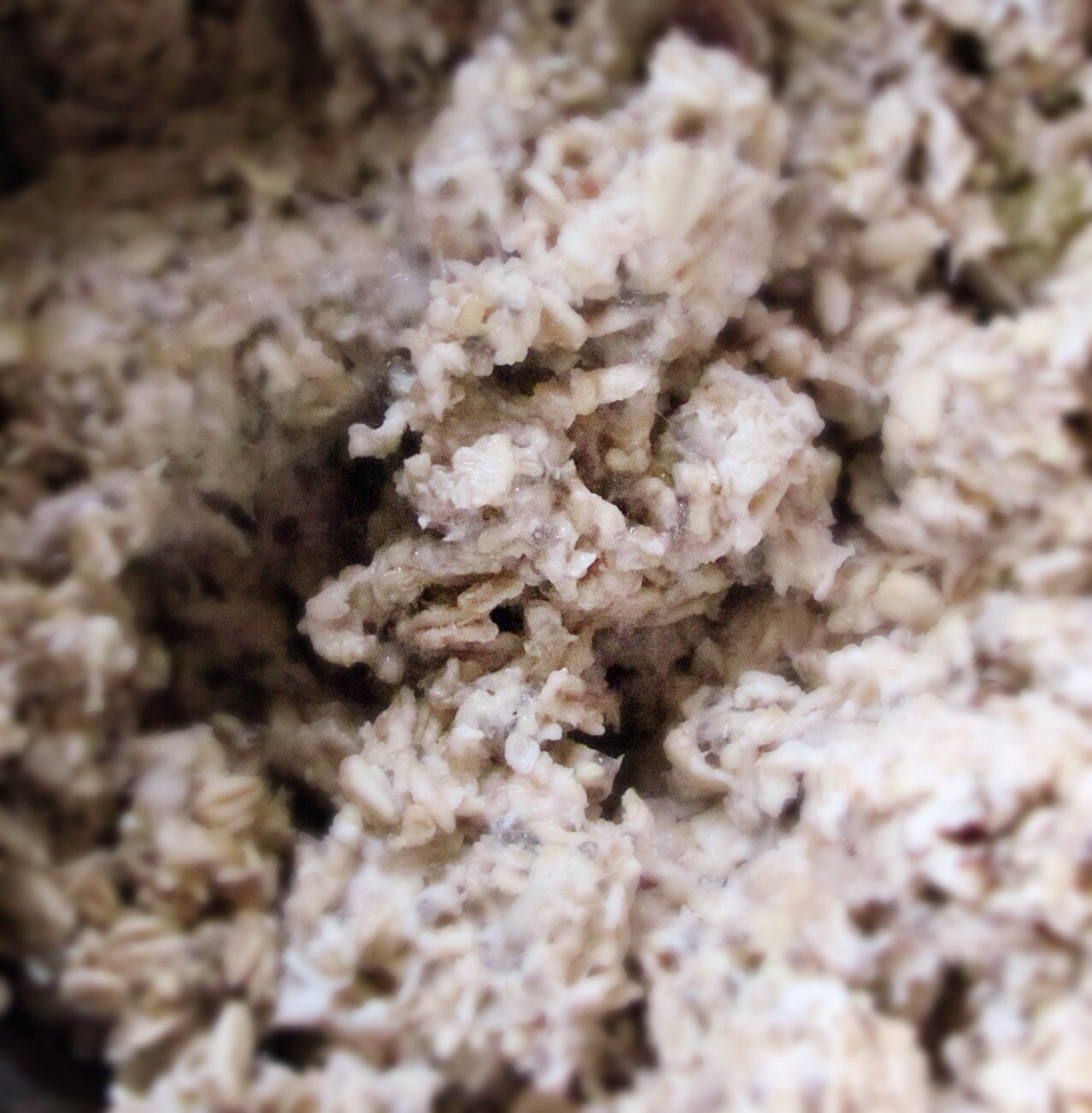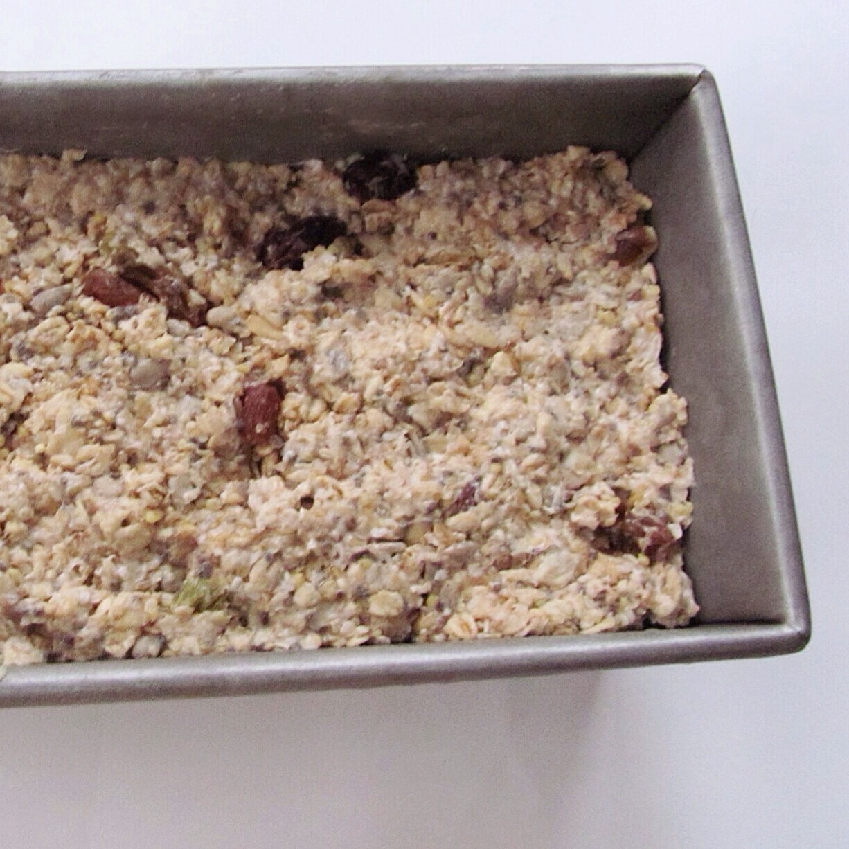 In the morning, stir once more and preheat the oven to 325°. Grease a 9 x 5 inch loaf pan really well. Dump the oat mixture into the loaf and pack it down. Get it really compressed and even.
