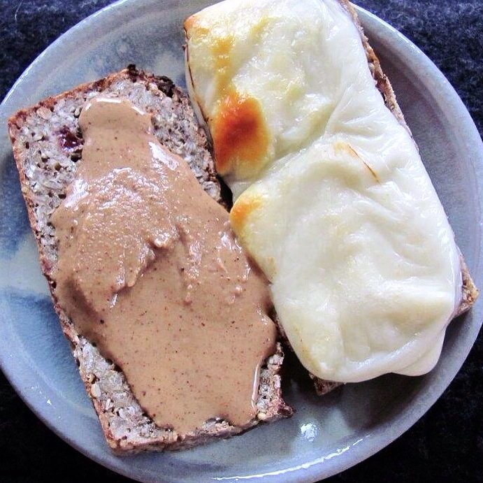 It was the process of mindful eating that lead me to become interested in experimenting recently with something new for breakfast. One of my favorite bloggers, Sarah Britton published an intriguing recipe on her gorgeous blog, My New Roots. It is a whole grain bread called The Life Changing Loaf of Bread. I tweaked the recipe and it has become my breakfast ritual. I love the oaty, toasty taste and the substantial texture. Bob likes it, too. I usually have one slice with melted cheese and the other toasted, with coconut almond butter or natural peanut butter. It is dense and heavy in a good way, slightly sweet and moist. I feel nourished and well fueled after I eat it (following my 5-7 mile run most days), and I’m not hungry for many hours.