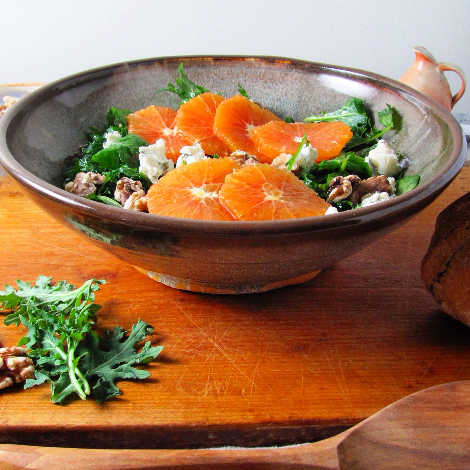 Put the kale into your lovliest salad bowl, preferably one made by a local potter. Or me. And arrange the walnuts, cheese and orange rounds perfectly over top. This salad can hang out in the fridge for up to a day if you want to eat it cold. Or you can toss and eat it right away and it will be room temp-ish.