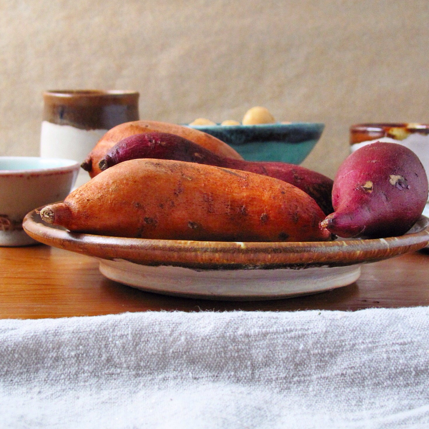 Our supermarket carries these wonderful organic baby sweet potatoes. The packages say organic japanese yams or jewel yams. I doubt this label is in any way accurate; I’m pretty sure they are sweet potatoes. Some packages contain orange skinned and others purple skinned little roots. The flesh of the orange ones is orange. The flesh of the purple ones is white. Both are wonderful; the purple ones taste a little like chestnuts.
