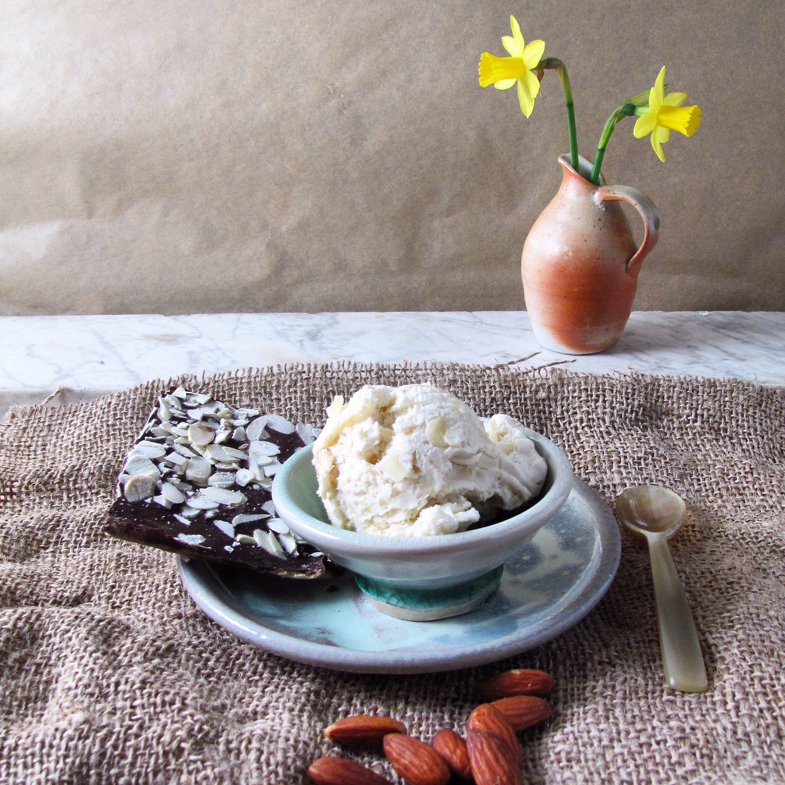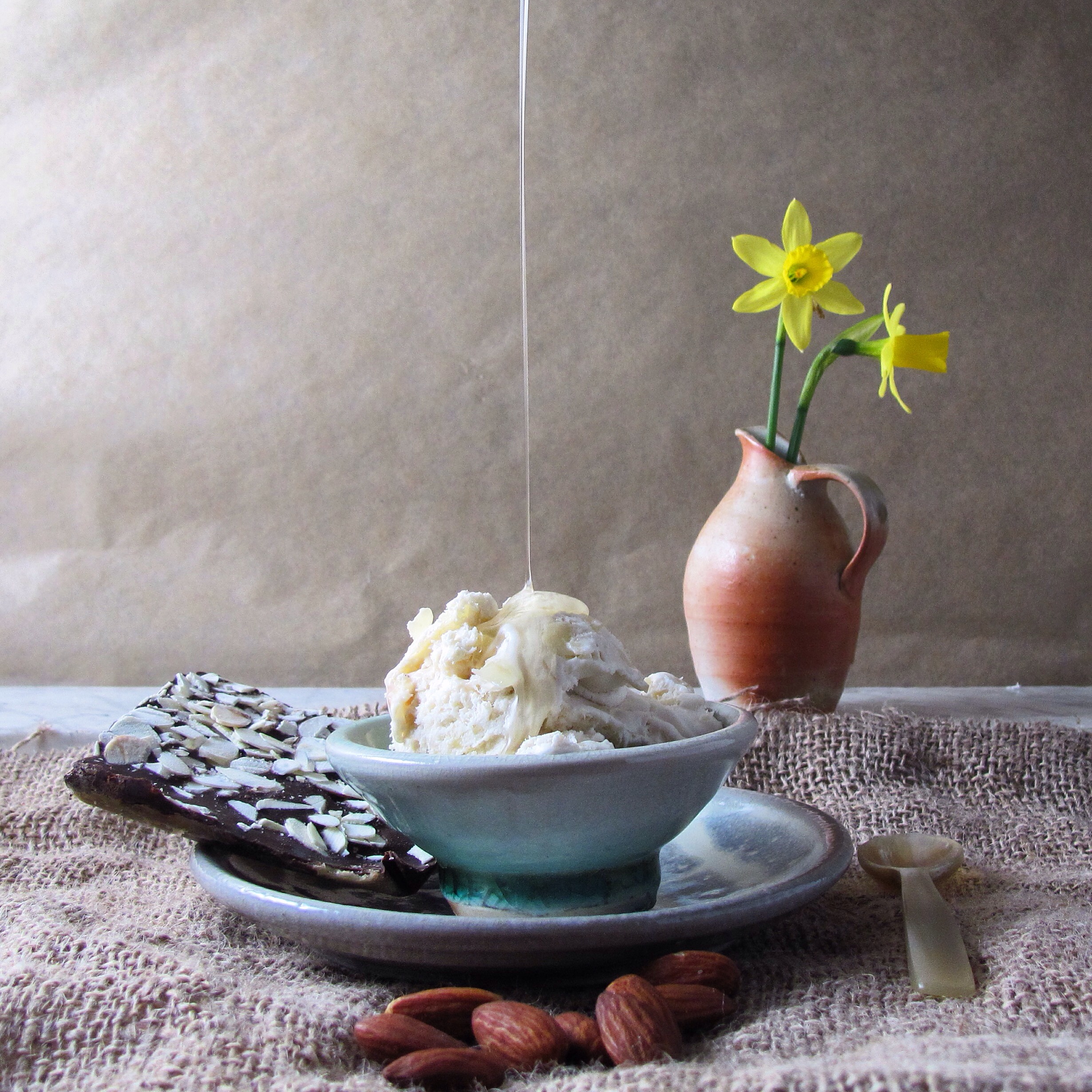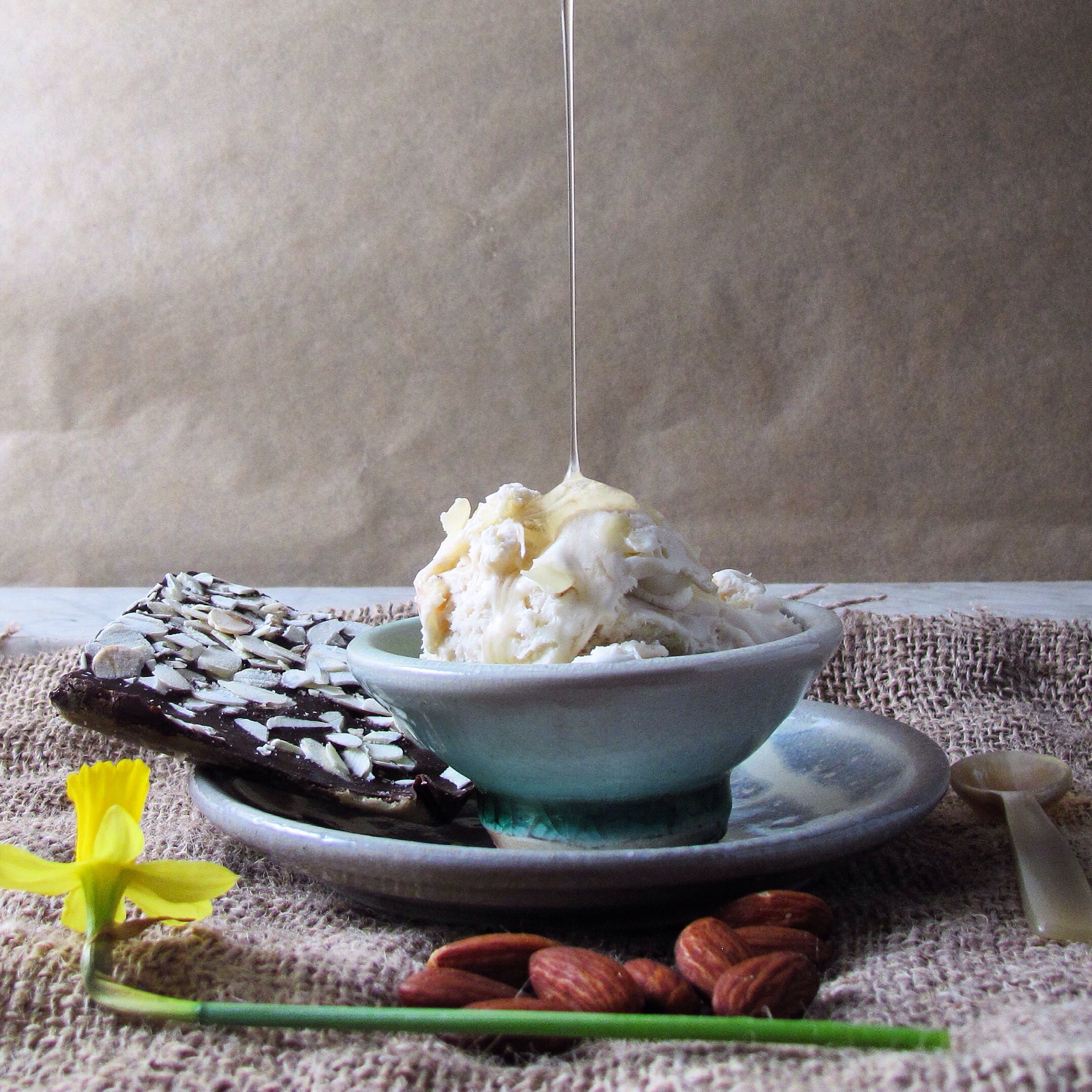 This ice cream is wonderful plain. But it is also great with a drizzle of agave, some extra almonds, or hot fudge. And it is amazing with fruit-berries or peaches in particular.