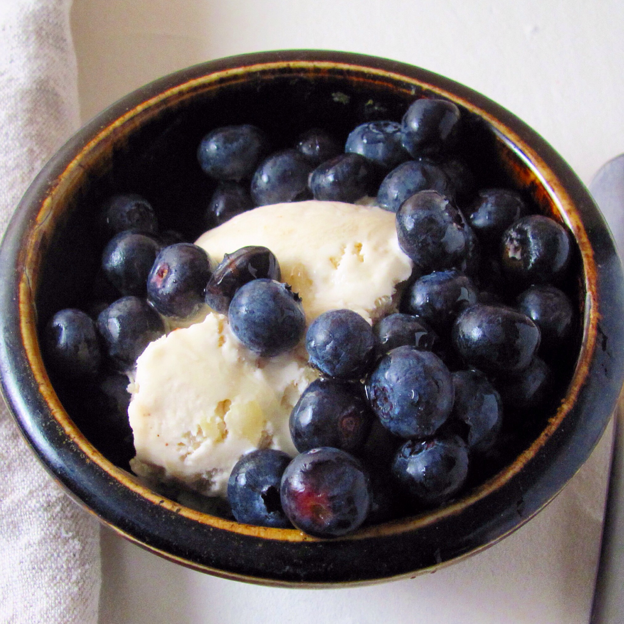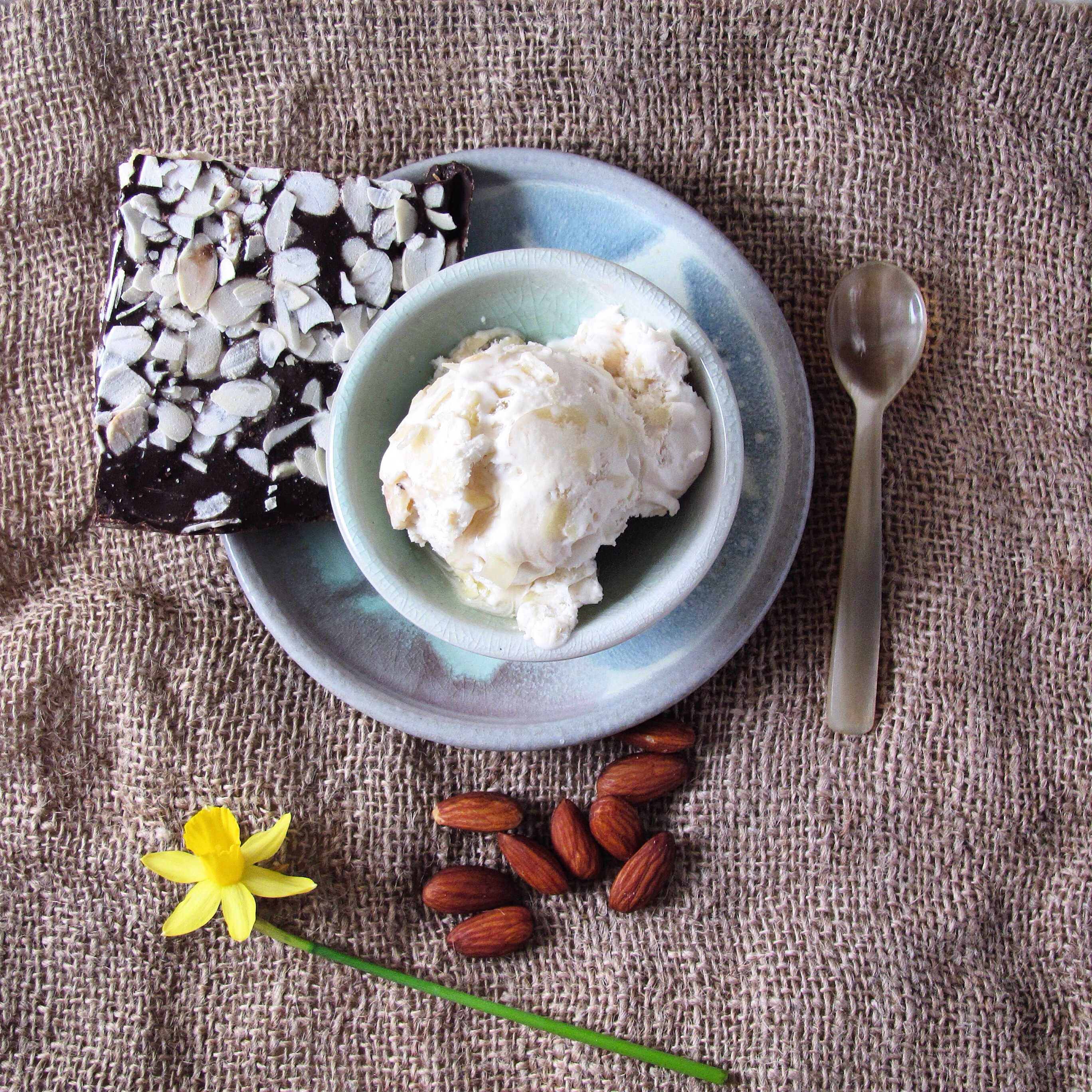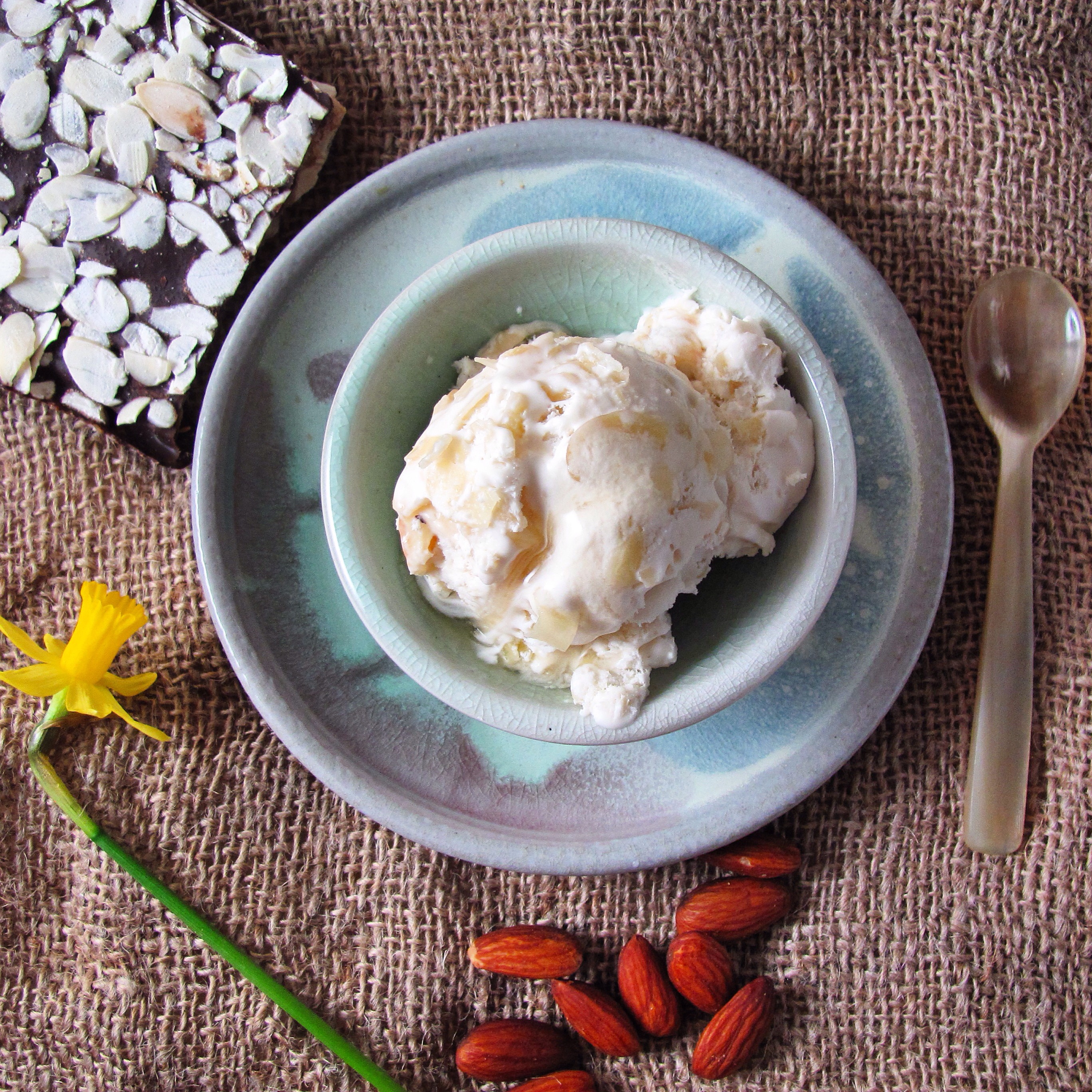 This ice cream is wonderful plain. But it is also great with a drizzle of agave, some extra almonds, or hot fudge. And it is amazing with fruit-berries or peaches in particular.