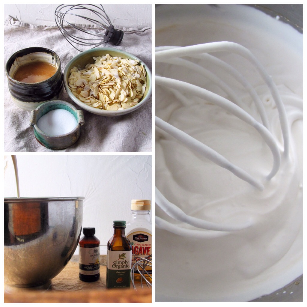 Beat the cream until soft peaks form. Add the extracts, salt and agave and beat to stiff peaks. Fold in the caramel sauce and the almonds. Freeze until firm, at least 6 hours.