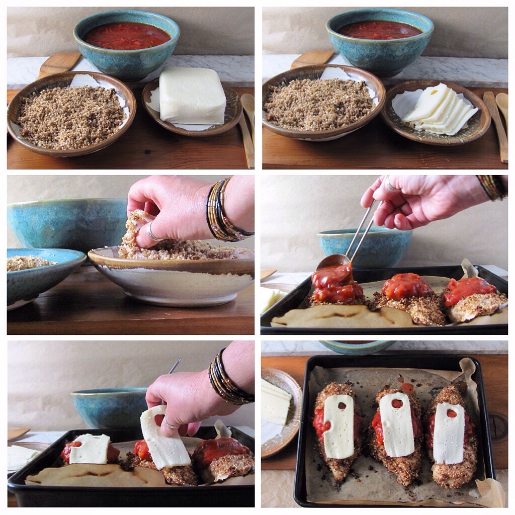 This chicken parm is pretty healthy and low fat. You may make it gluten free, as I have done here, by substituting Mindfulness Bread crumbs* for the panko in the coating. I prefer the packaged, square mozzarella for this recipe. Good fresh mozz has too much moisture and makes everything too soggy.