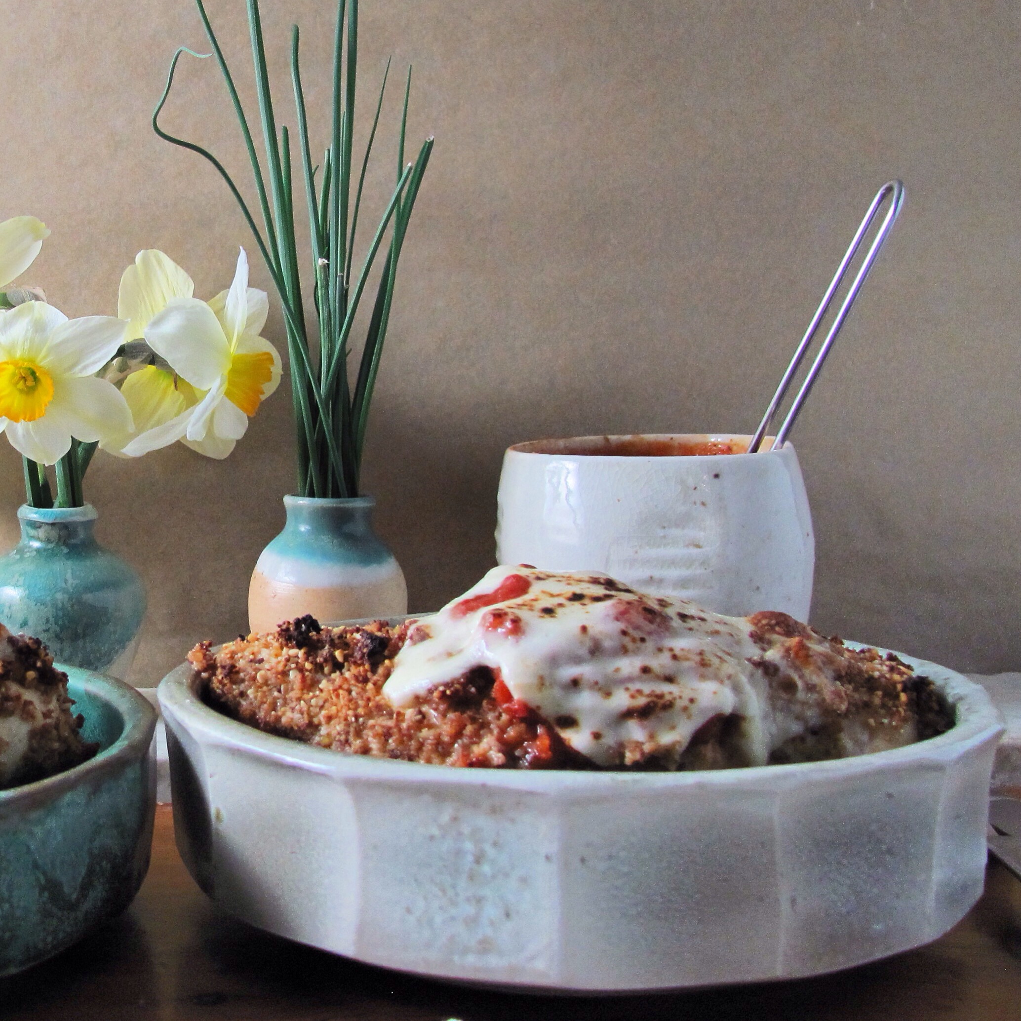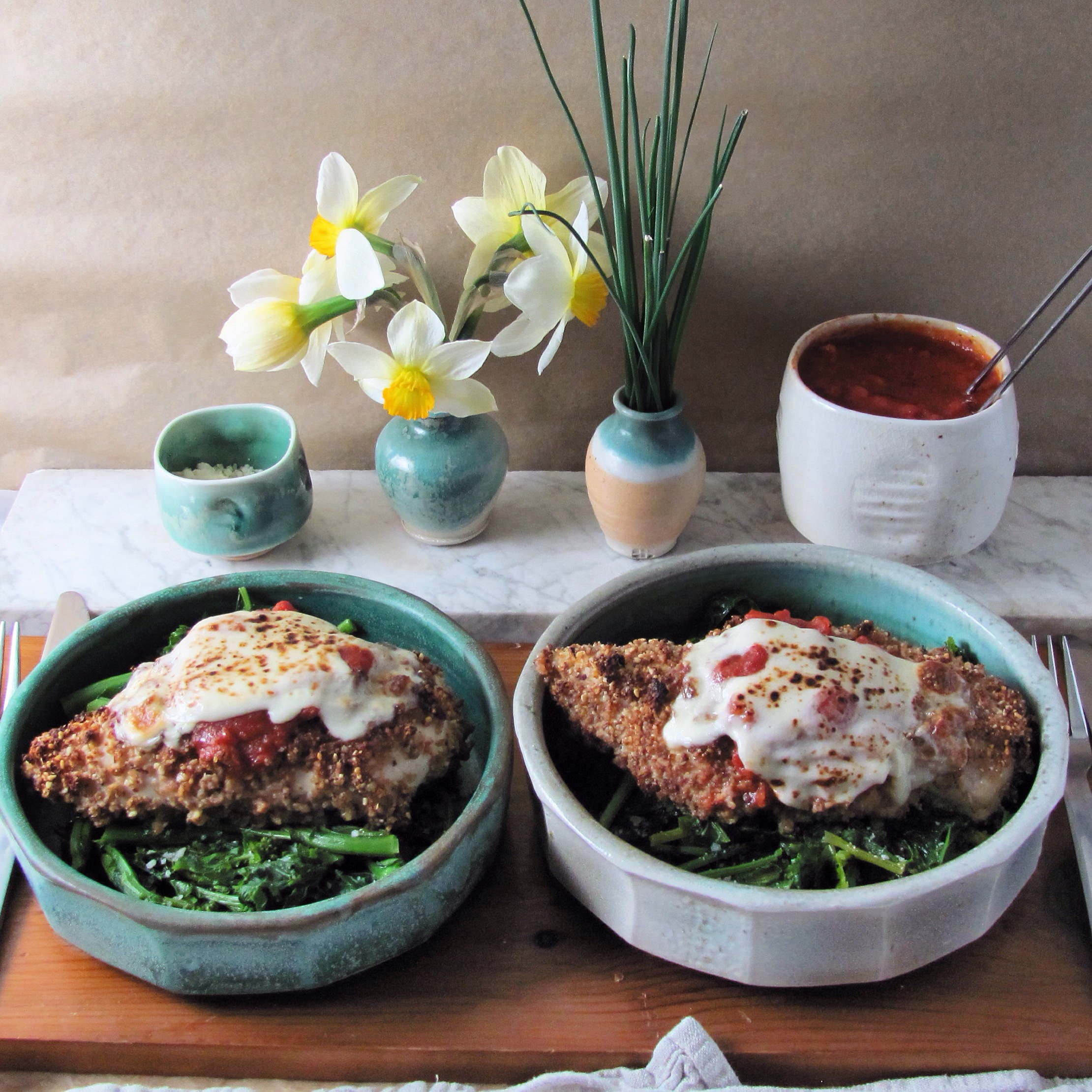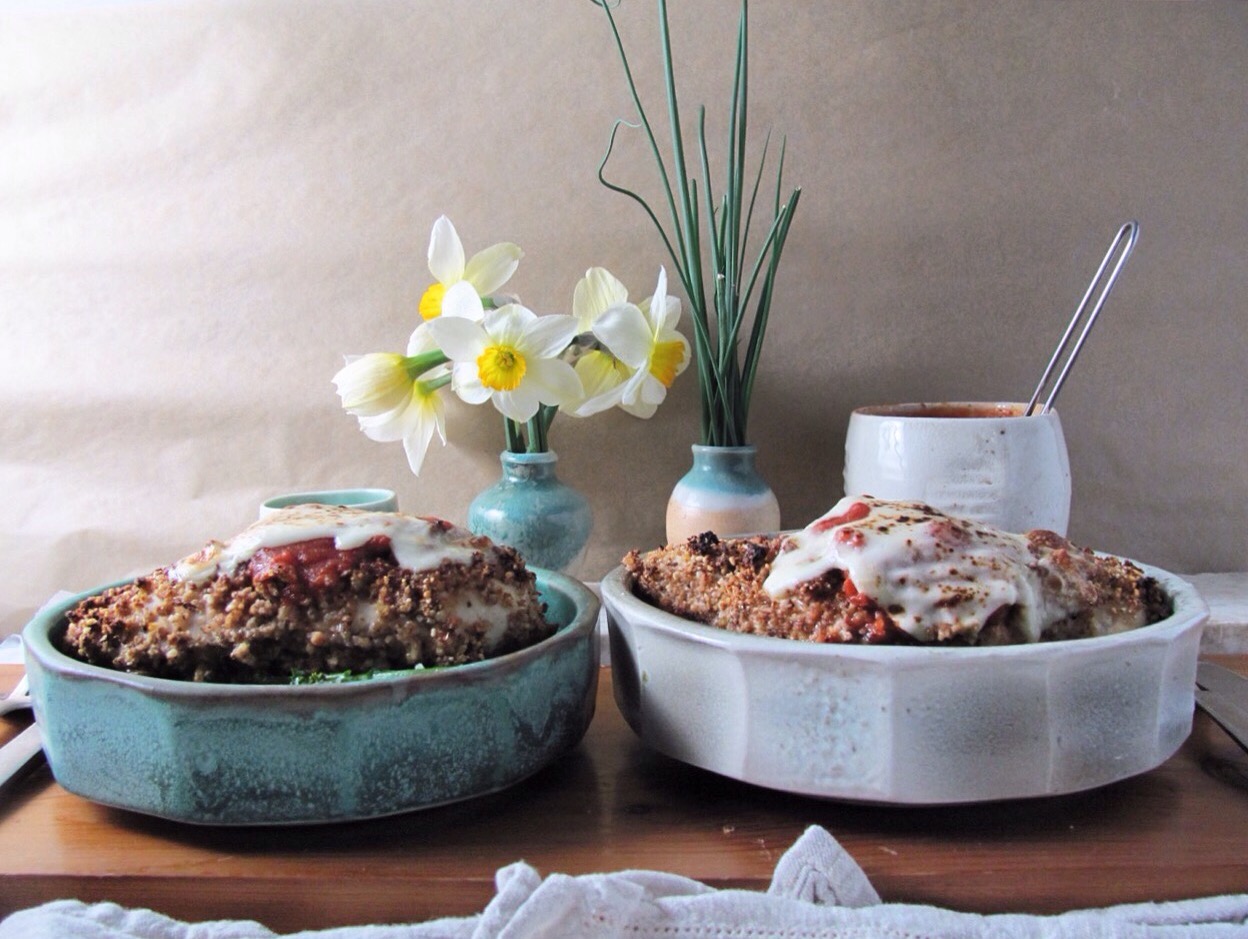 The meaning of the craving became clear to me: I need to practice what I preach: Live in the moment. I don’t need to have my new kitchen or even to have made linear progress towards that goal. I can practice mindfulness. I will embrace what I have now. I went to the store and bought the ingredients to make and photograph this wonderful dish for you today. I hope you don’t mind that I’m still using the toaster to bake. I hope you don’t mind that there are still wires banging me in the head while I am cooking, and that guys are sanding, nailing and sawing while I work. And I hope you enjoy making Chicken Parm wherever you are cooking right now.
