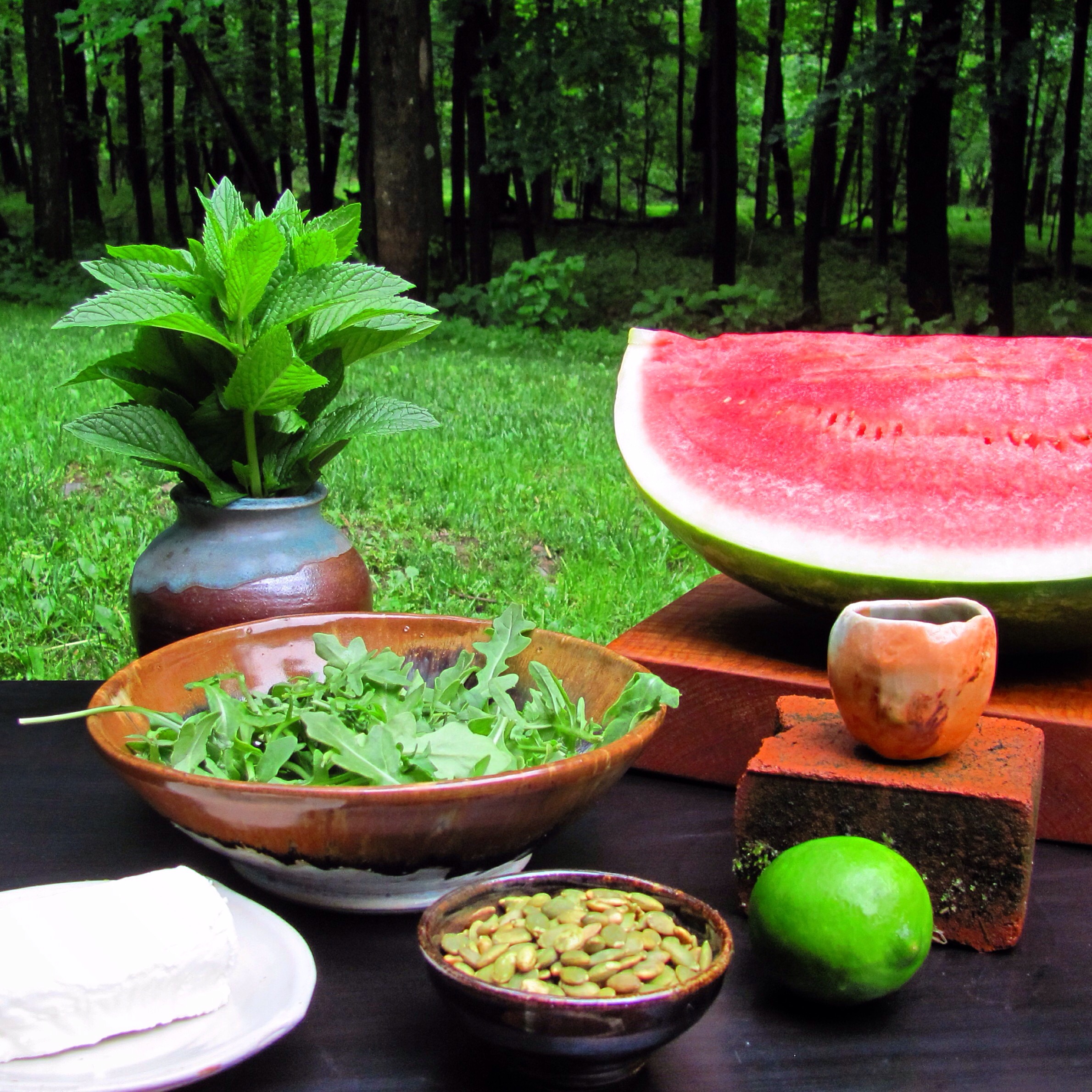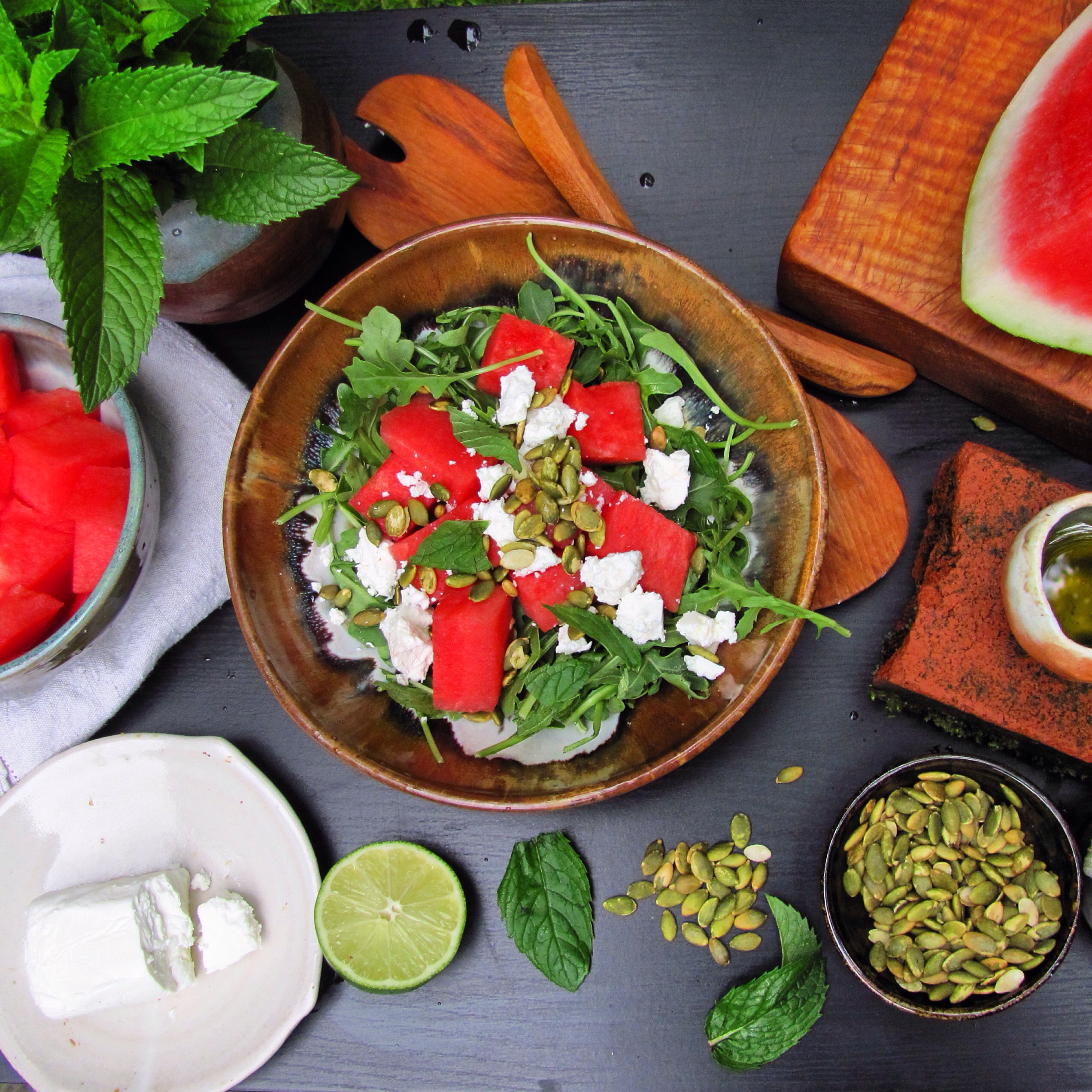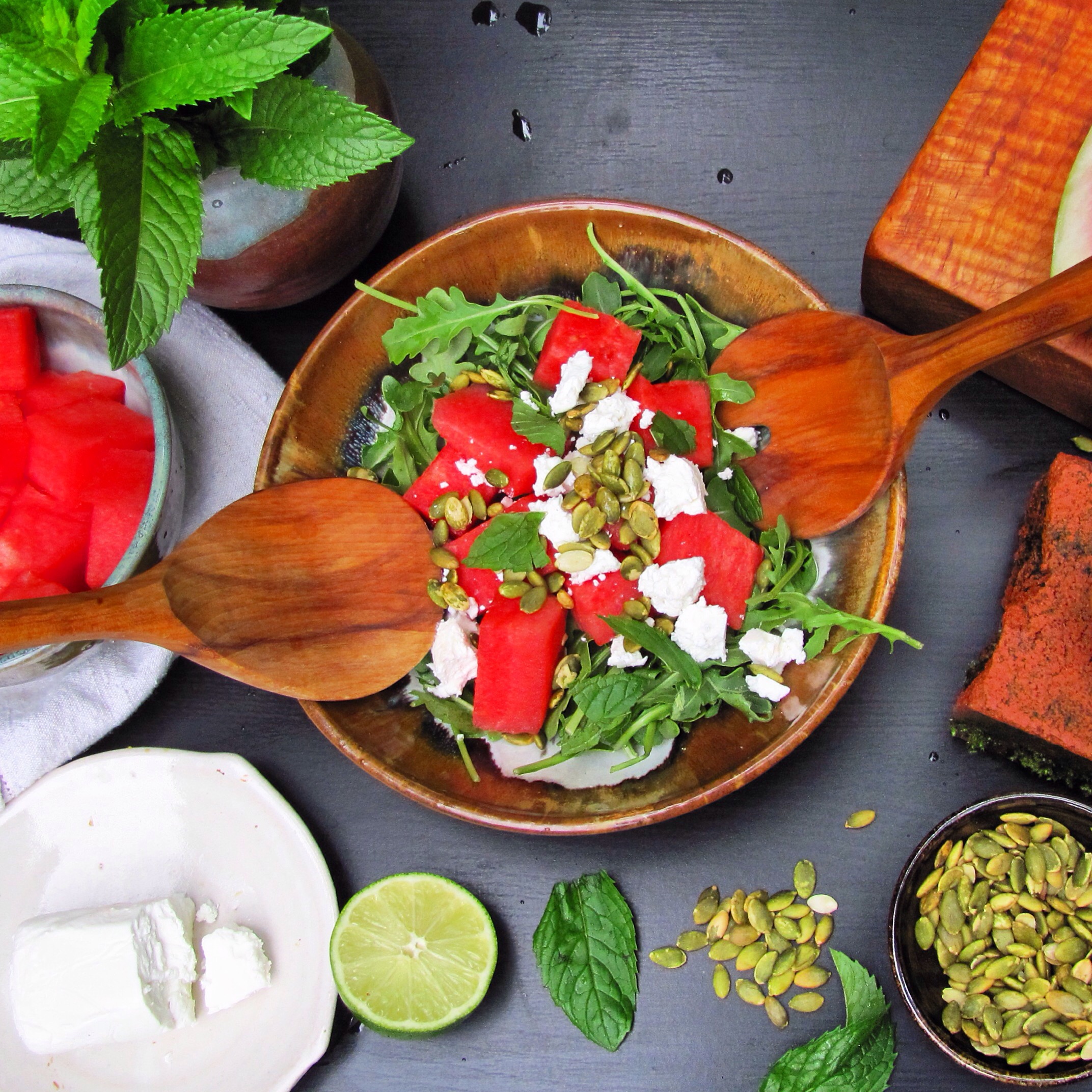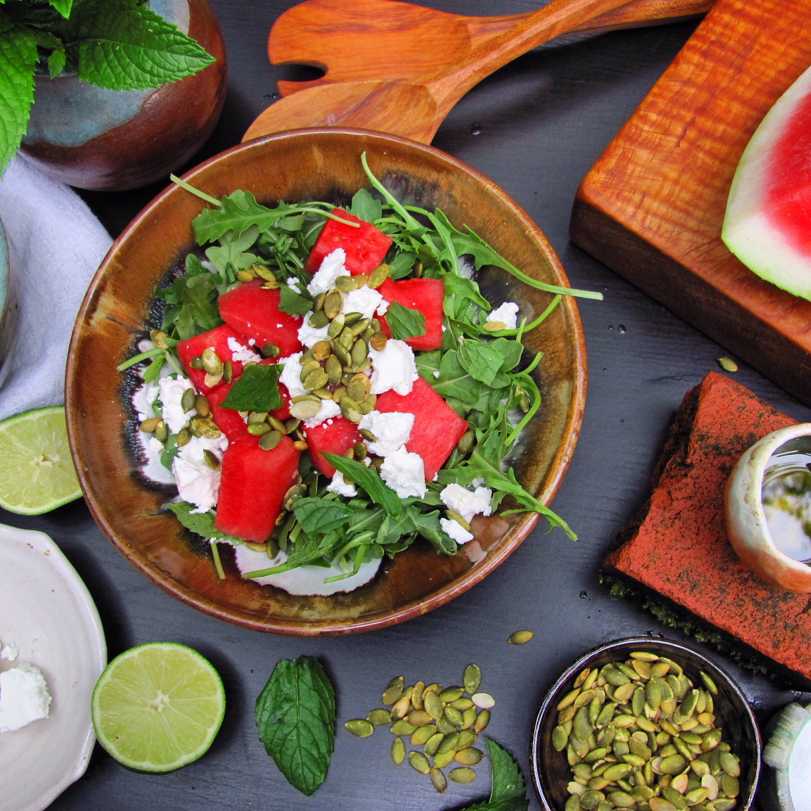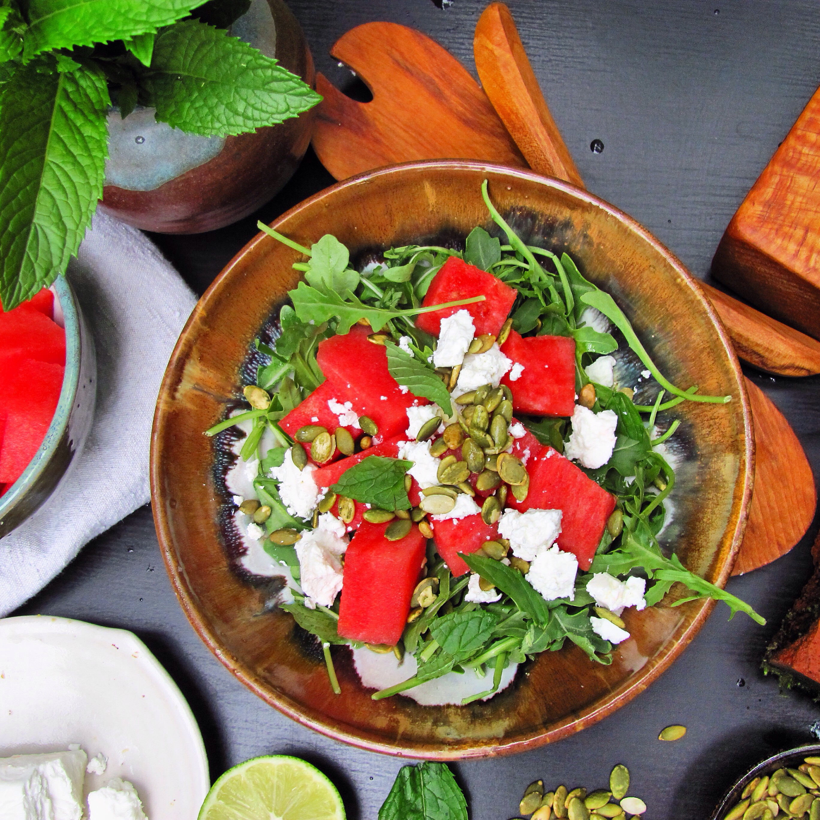 A few years ago, I started seeing recipes for savory-sweet watermelon salads and, at first I was uninterested. But I remembered my mom telling me her father used to love watermelon with salt, and I decided to give it a try. My grandfather was right! A little salt brings out the sweet juiciness of the melon; which in turn plays well with the bitterness of arugula and the rich fattiness of cheese and nuts. Even if you’re dubious, try it! Let me know what you think.