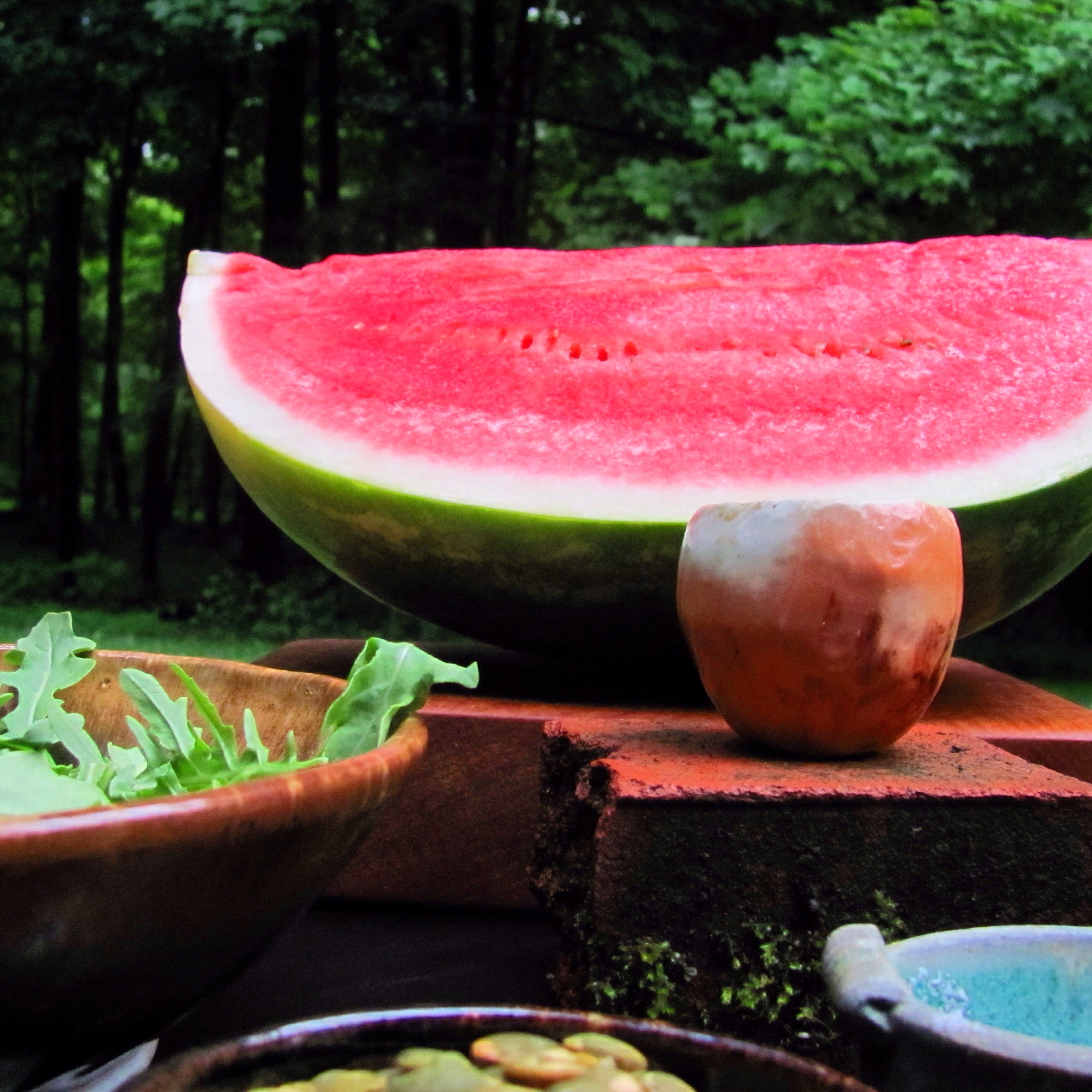 Watermelon is one of those foods for me. I won’t think of watermelon for months, but then the weather gets warm and I get an urge for a big, slurpy slice. With lime. I’m bummed that we now have these seedless hybrids because I like spicy watermelon seeds.