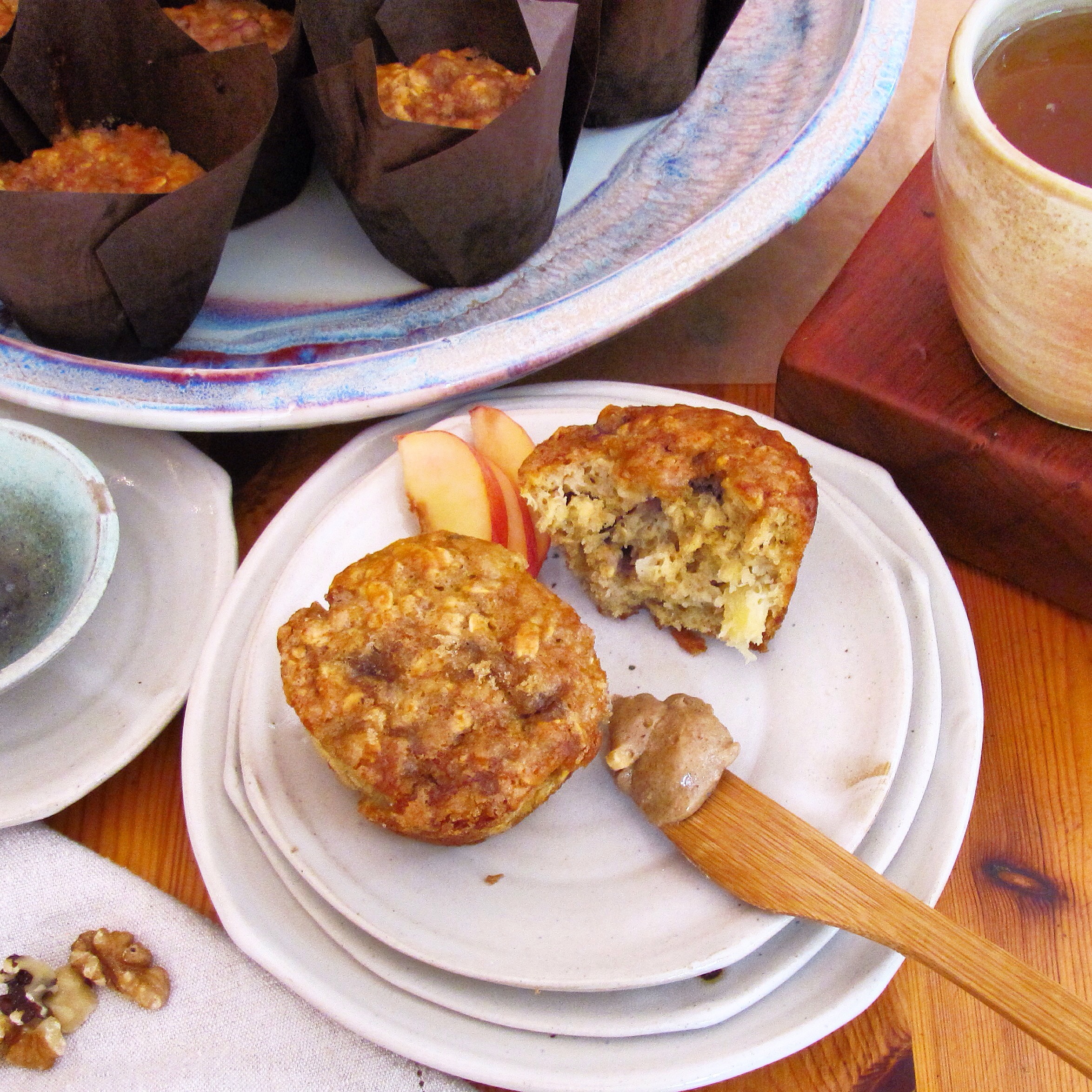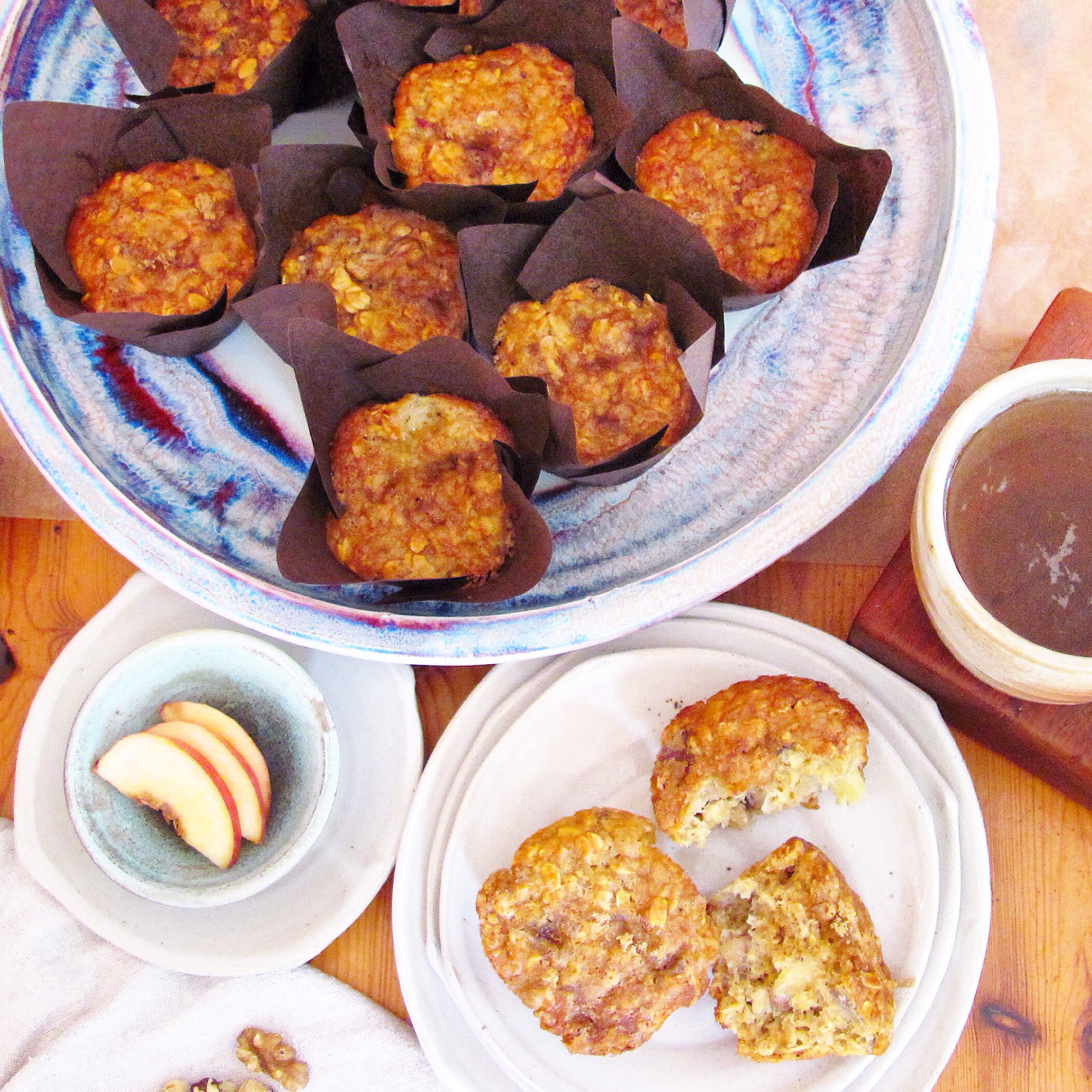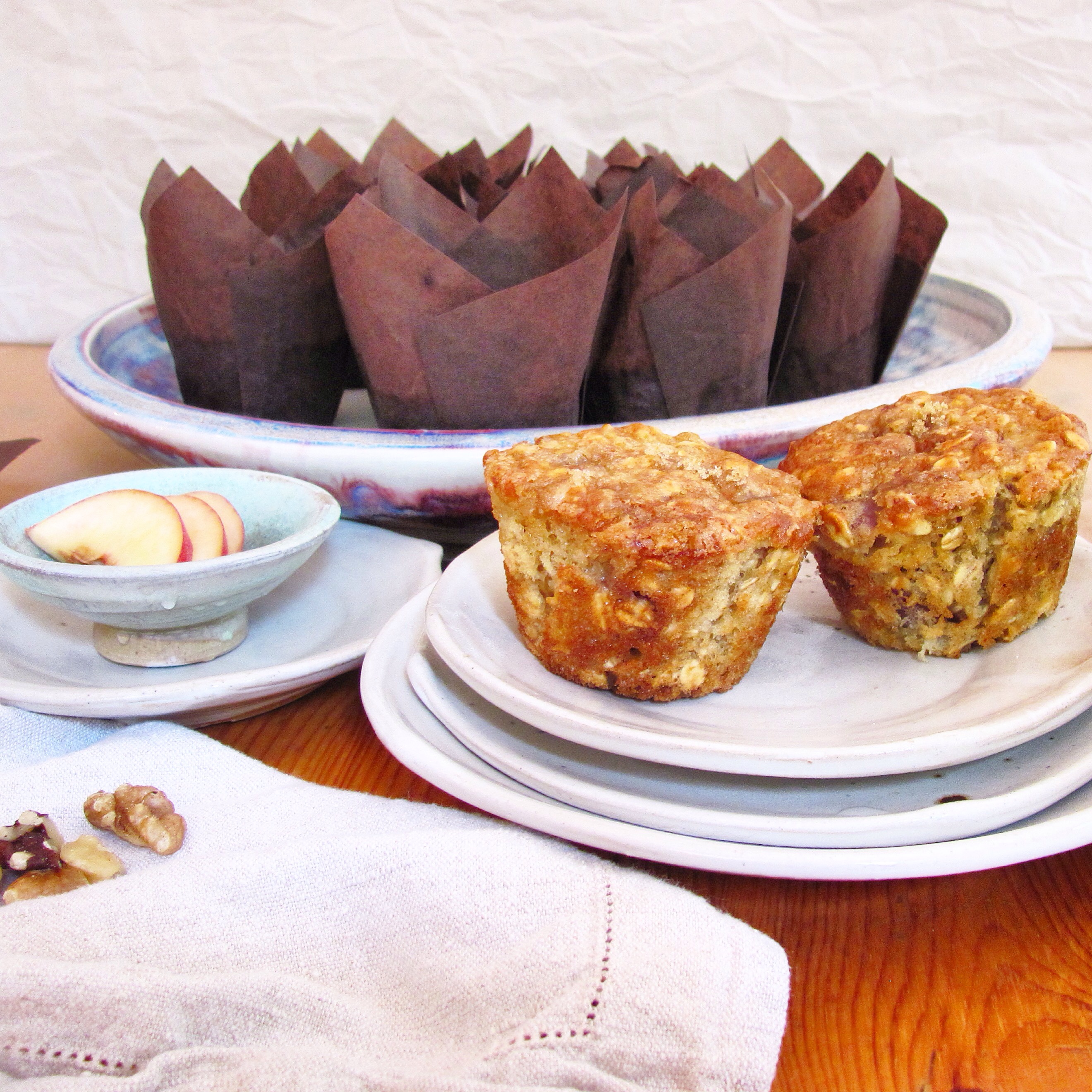 These are heathy-ish without being austere. Full of fruit, oats, and nuts, they are sweet, but won’t give you a sugar rush. They are moist and hearty, with a slight tang of yogurt. Pretty low fat, they contain a decent amount of protein, so perfect for breakfast or after your workout. I hope you love them!