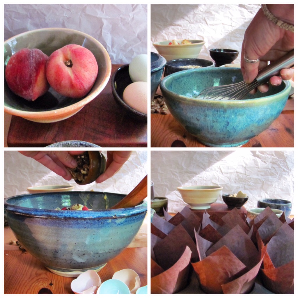 Guess what? We have an oven! We have a kitchen! None too soon because the farmer’s market is in full swing. Is there anything in the world better than a ripe summer peach? So, to celebrate the bounty of summer AND my brand new oven, I am happy to share with you this recipe for some peachy, summery muffins.