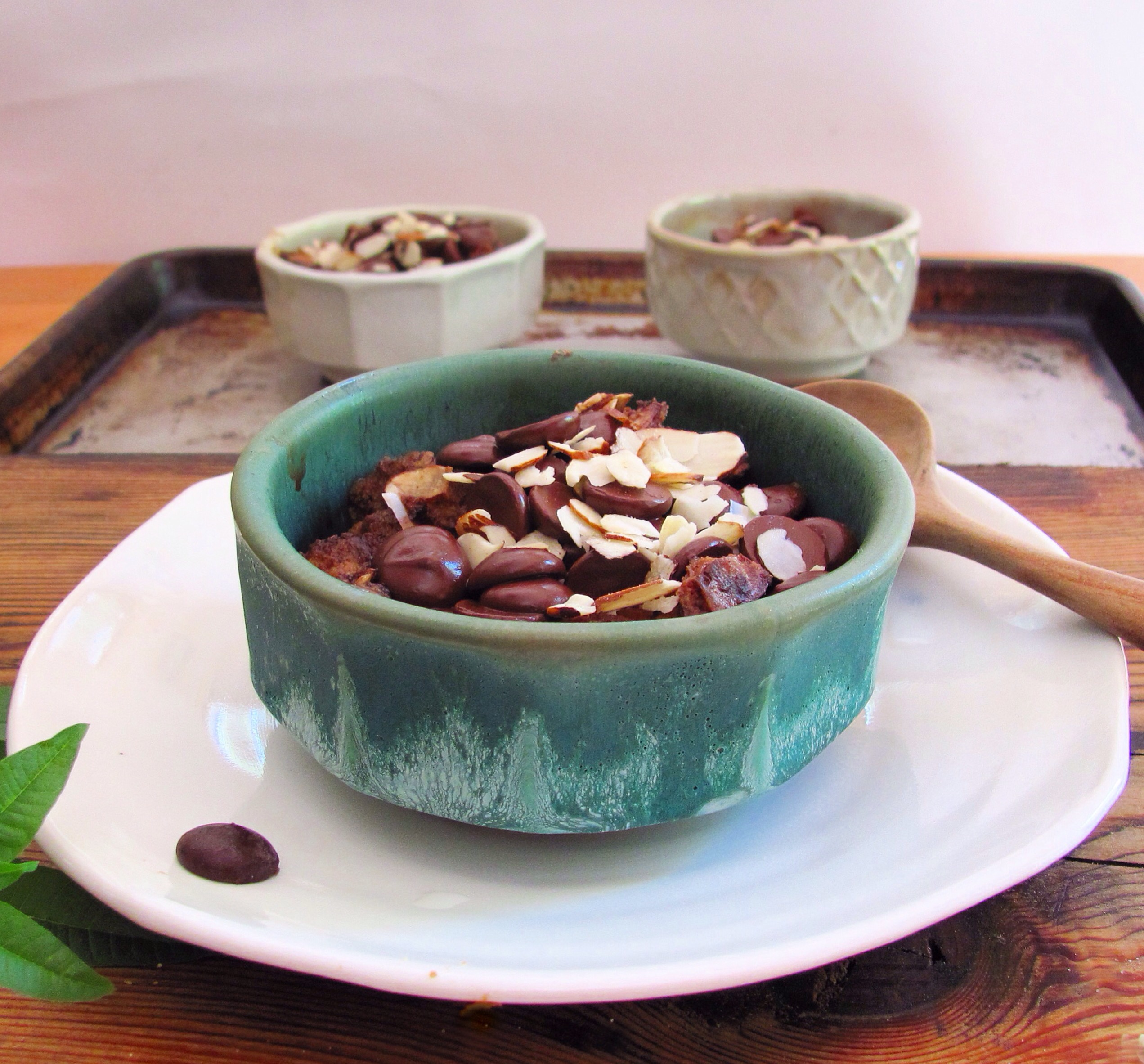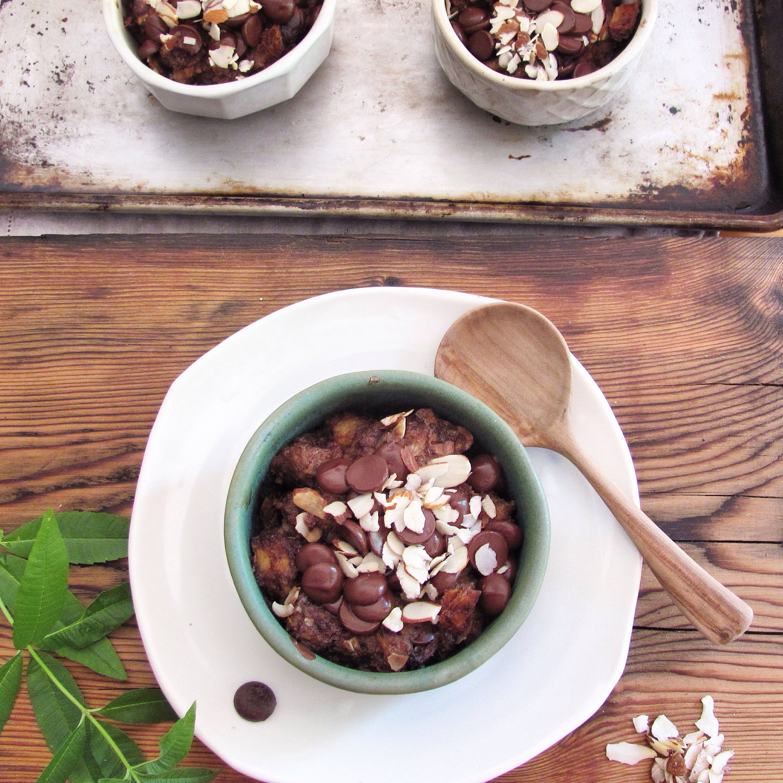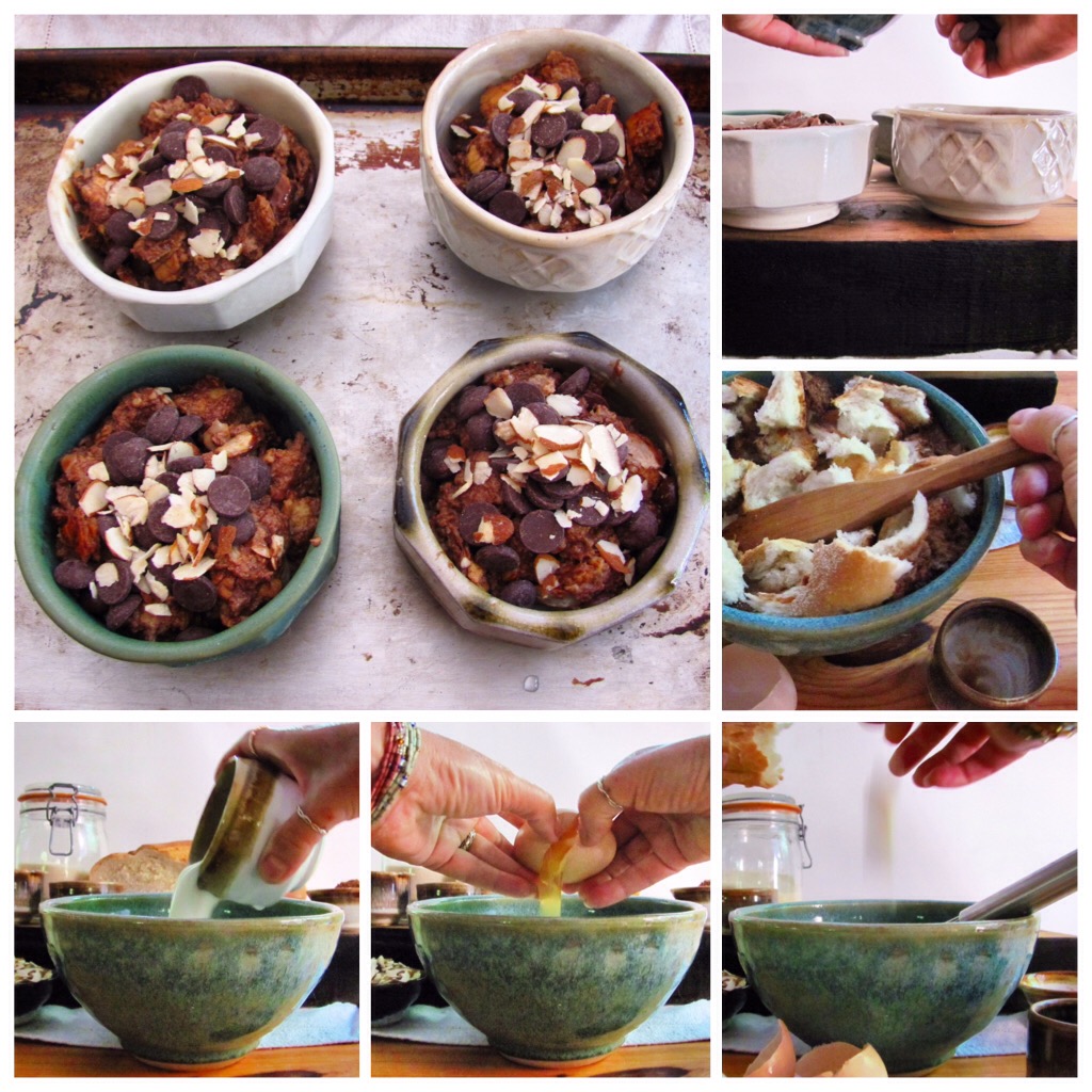 Oh, so the answer to what to do with the leftover bread is: bread pudding. Chocolate bread pudding. With two kinds of chocolate: cocoa and chocolate chips. And almonds, because almonds and bread and chocolate are just amazing together. The chocolate custard soaks the bread, making it soft and gooey inside and a bit crusty outside. Dark chocolate makes it rich and sophisticated, but the texture is pure, homey comfort. It will remind you of pudding and french toast and chocolate chip cookies all at the same time.