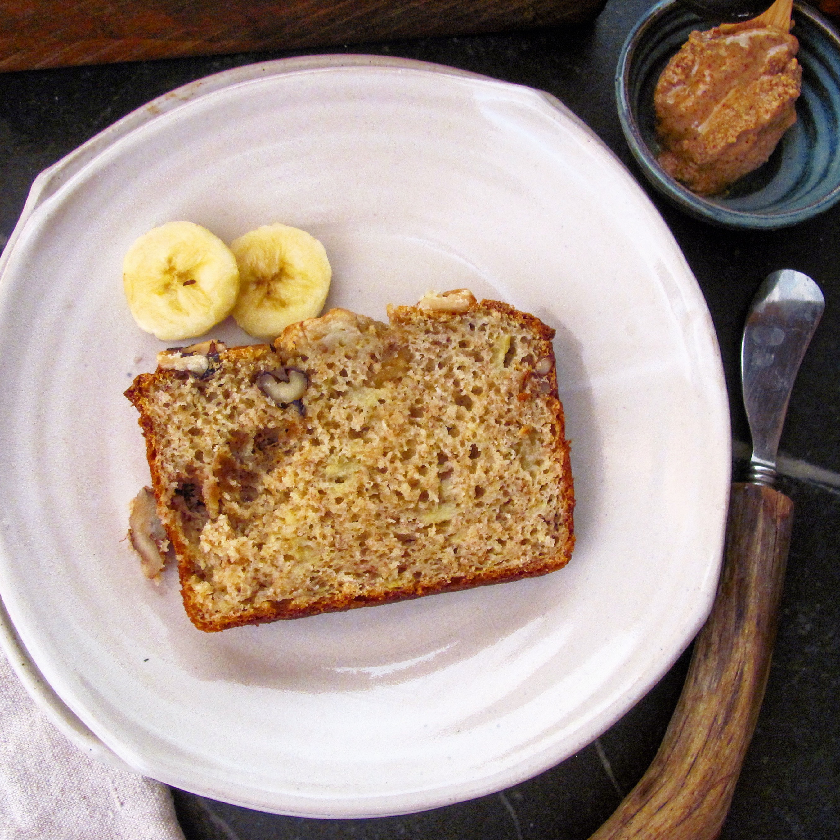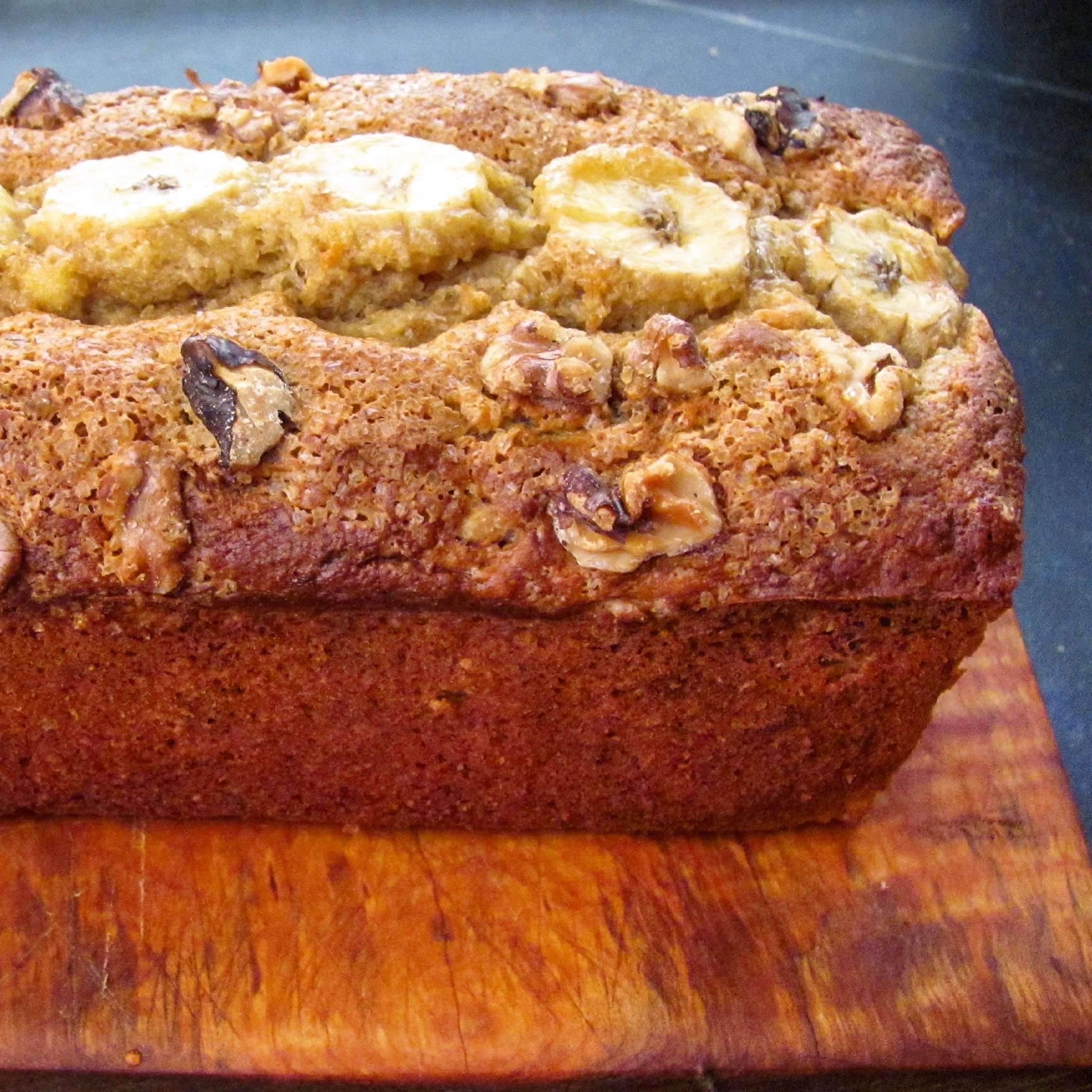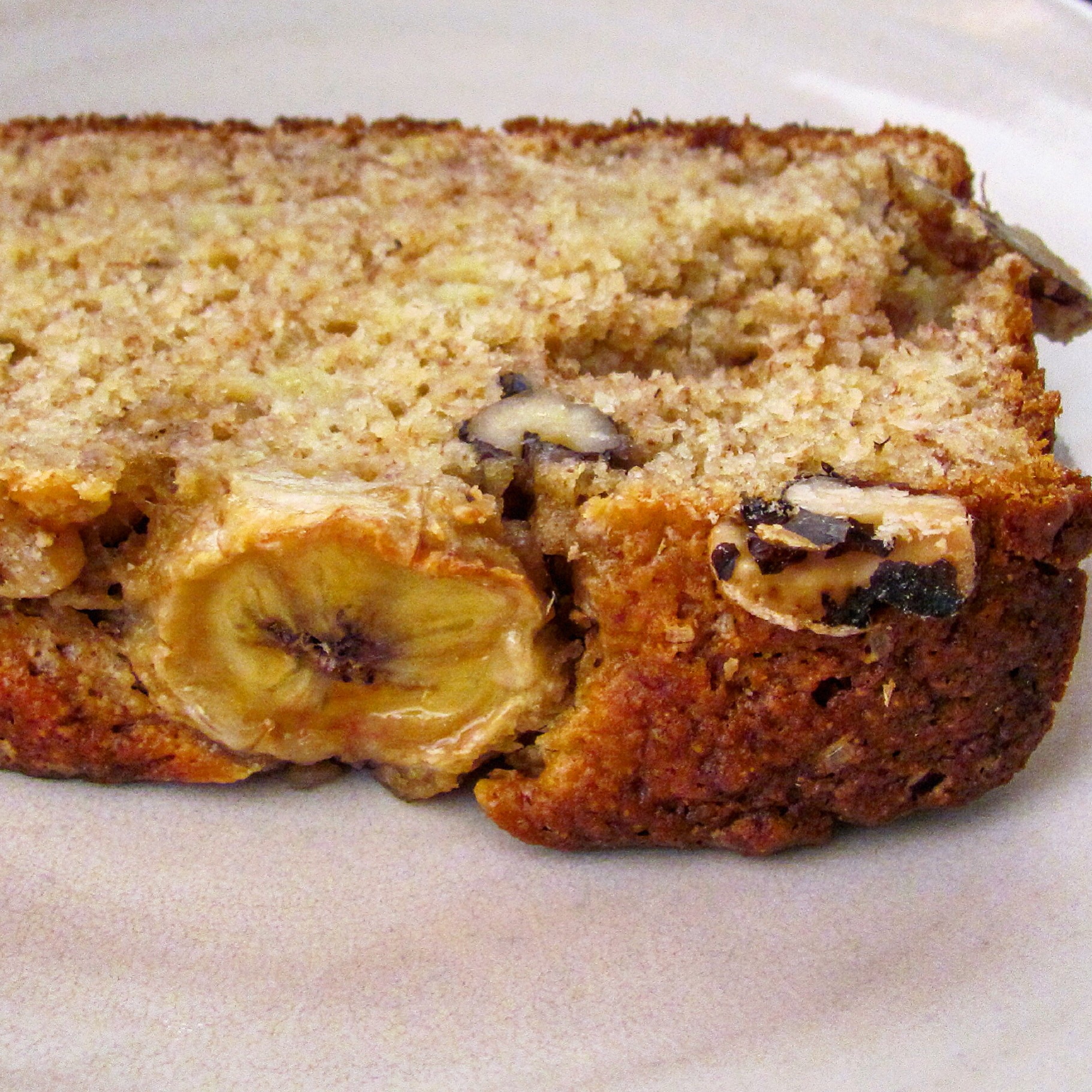 So, I had some fun with the camera and the light and the bananas. And then I took a nice, long walk with Ruth, my dear friend and office mate. And afterwards, I gave her a slice. She kept commenting how good it was. So I said banana bread is always good. She said how moist it was. And I said banana bread is always moist. She disagreed. She felt that this was an unusual slice of banana bread. She was quite adamant about it.