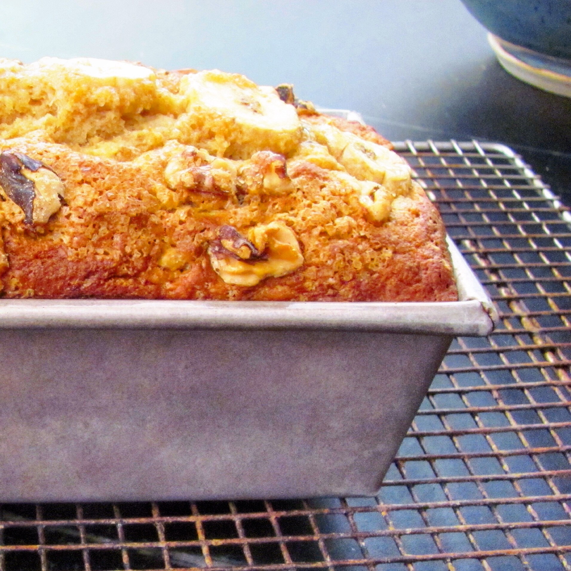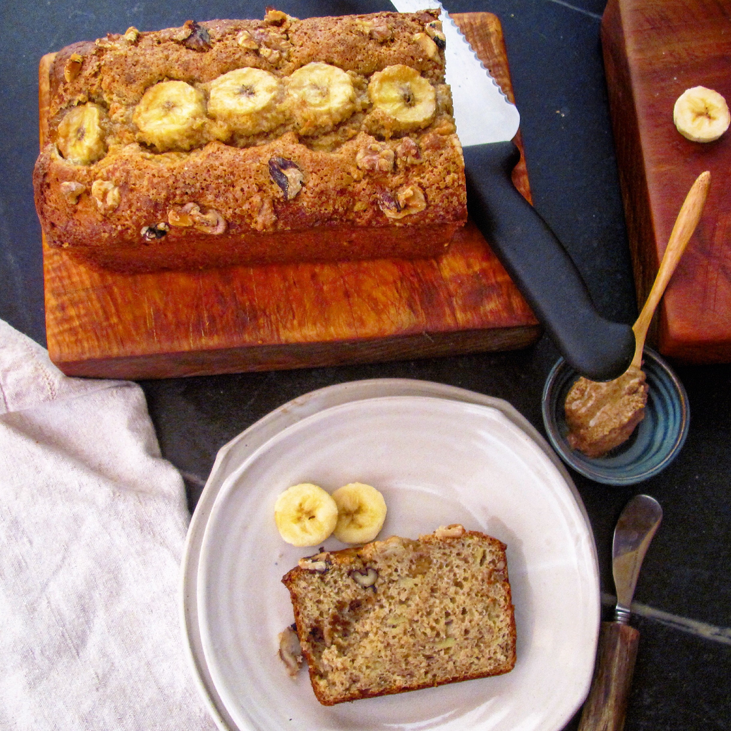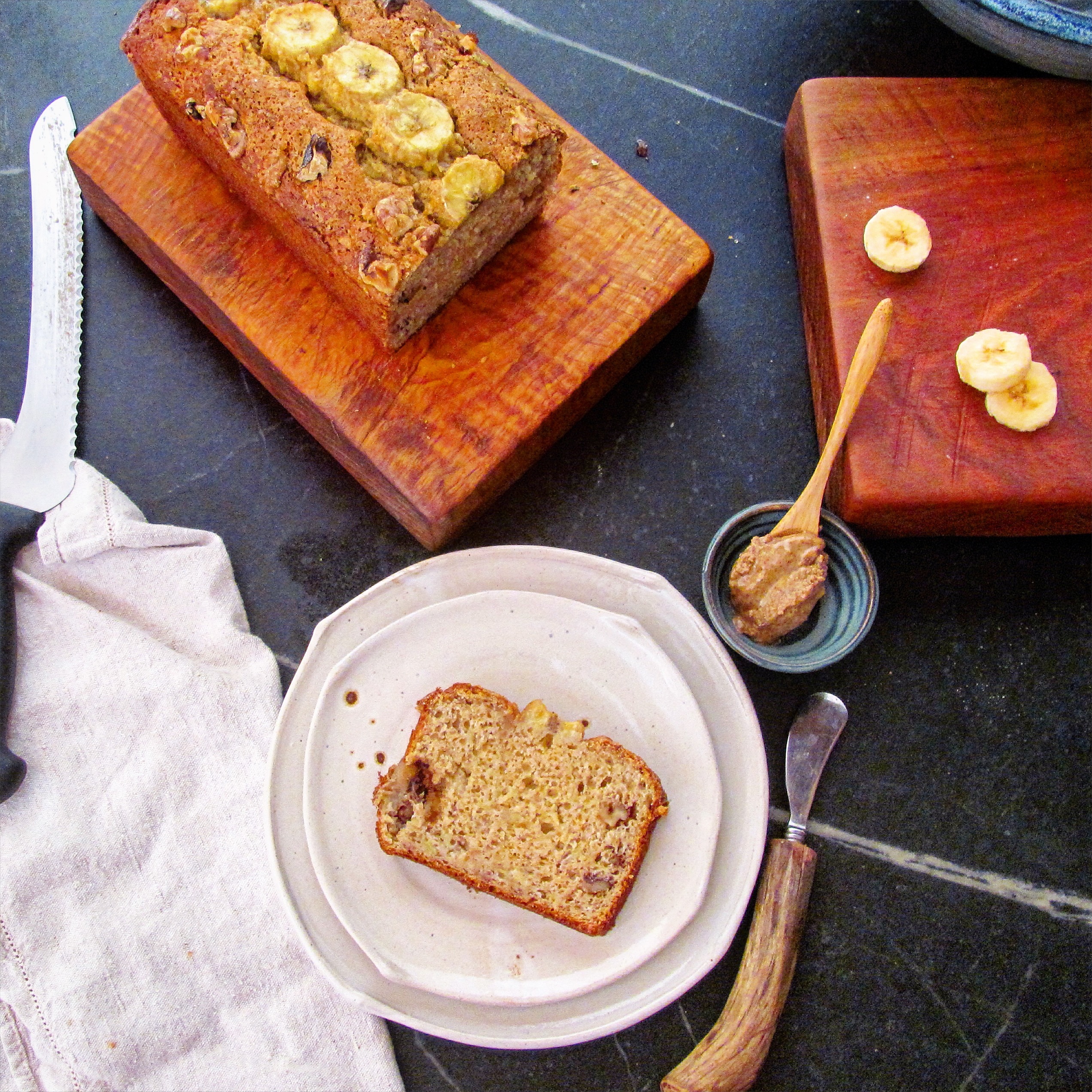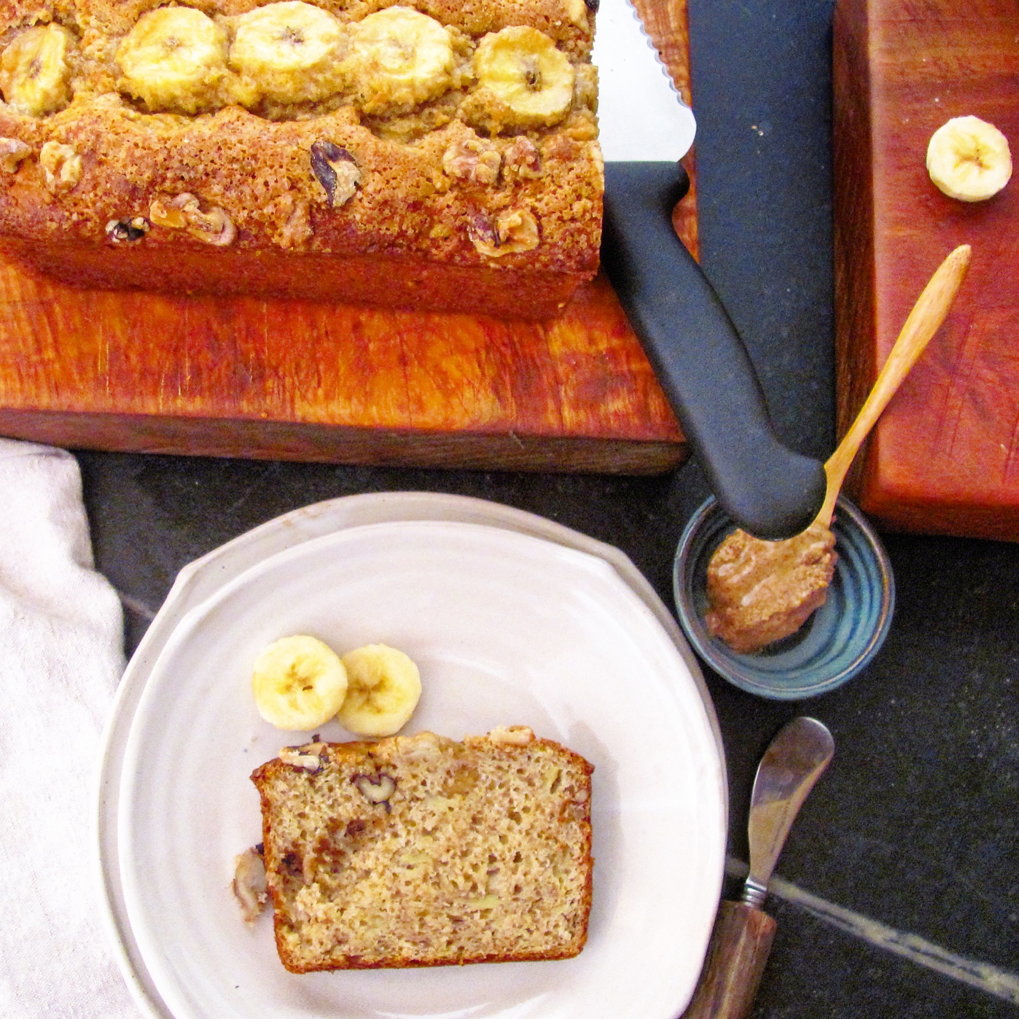 So, I had some fun with the camera and the light and the bananas. And then I took a nice, long walk with Ruth, my dear friend and office mate. And afterwards, I gave her a slice. She kept commenting how good it was. So I said banana bread is always good. She said how moist it was. And I said banana bread is always moist. She disagreed. She felt that this was an unusual slice of banana bread. She was quite adamant about it.