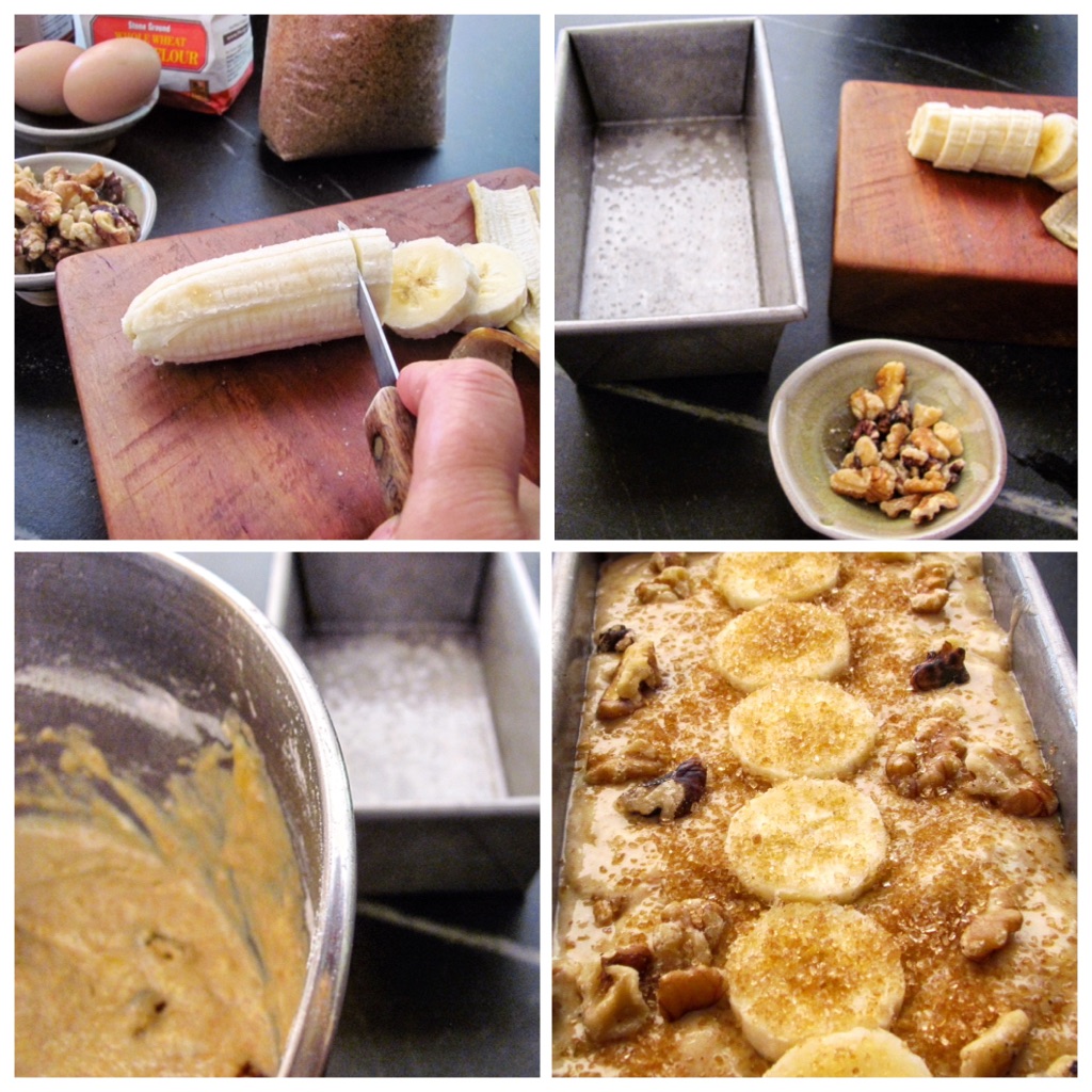 Scrape the batter into the loaf pan. Slice the remaining half banana and lay the slices across the top. Sprinkle with the coarse sugar.