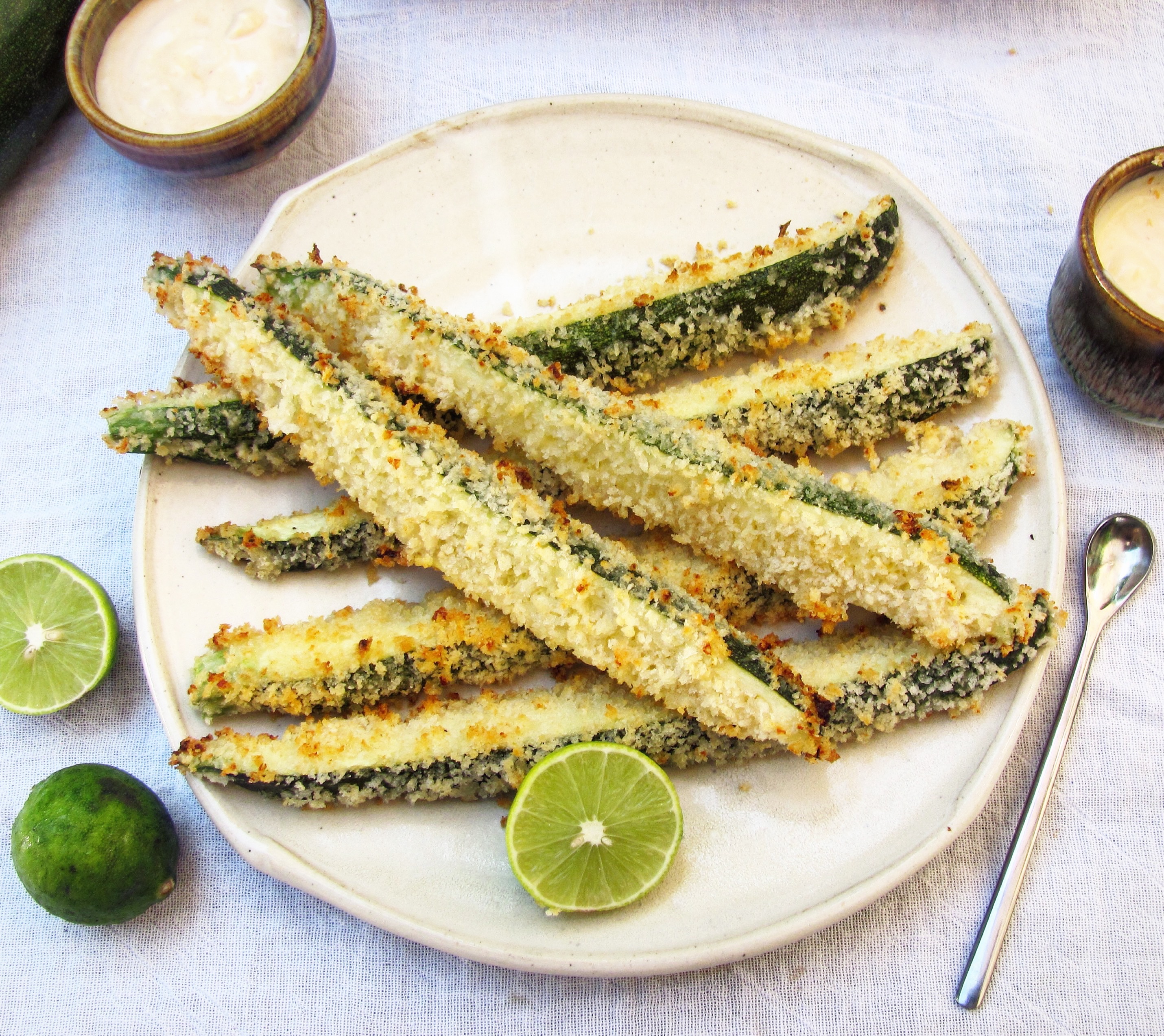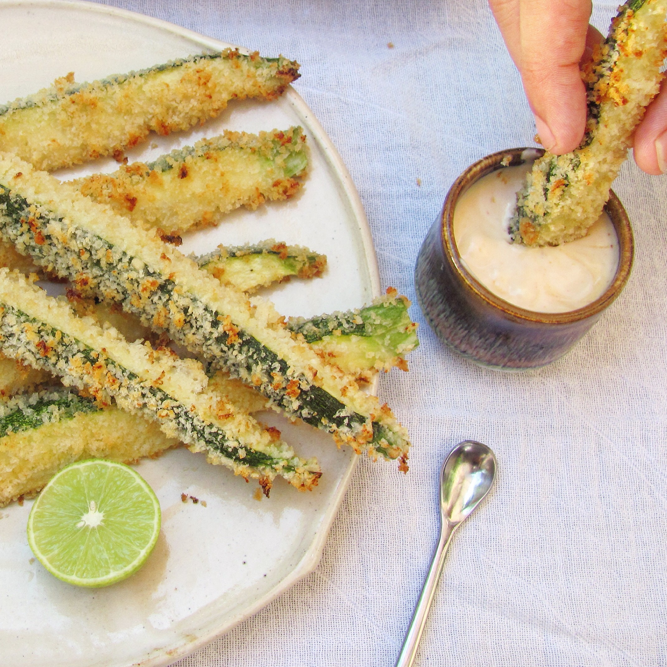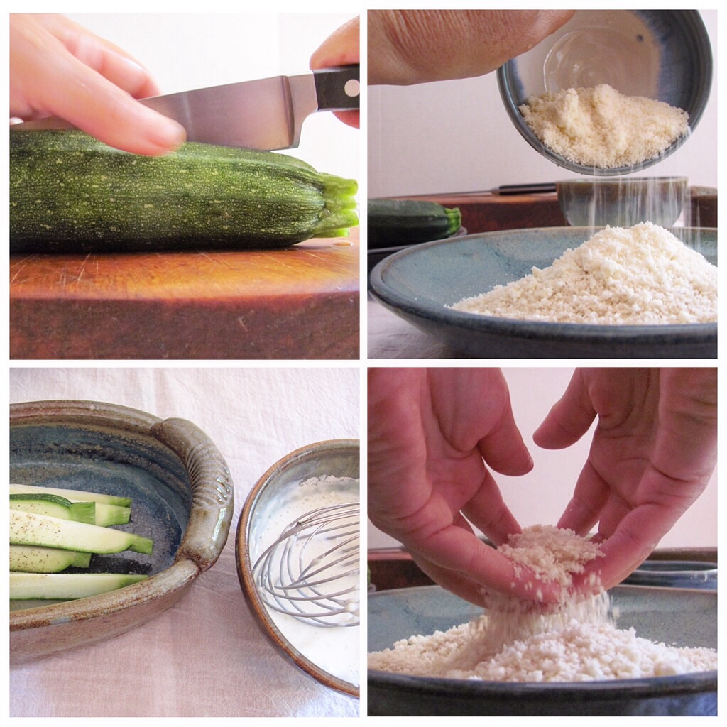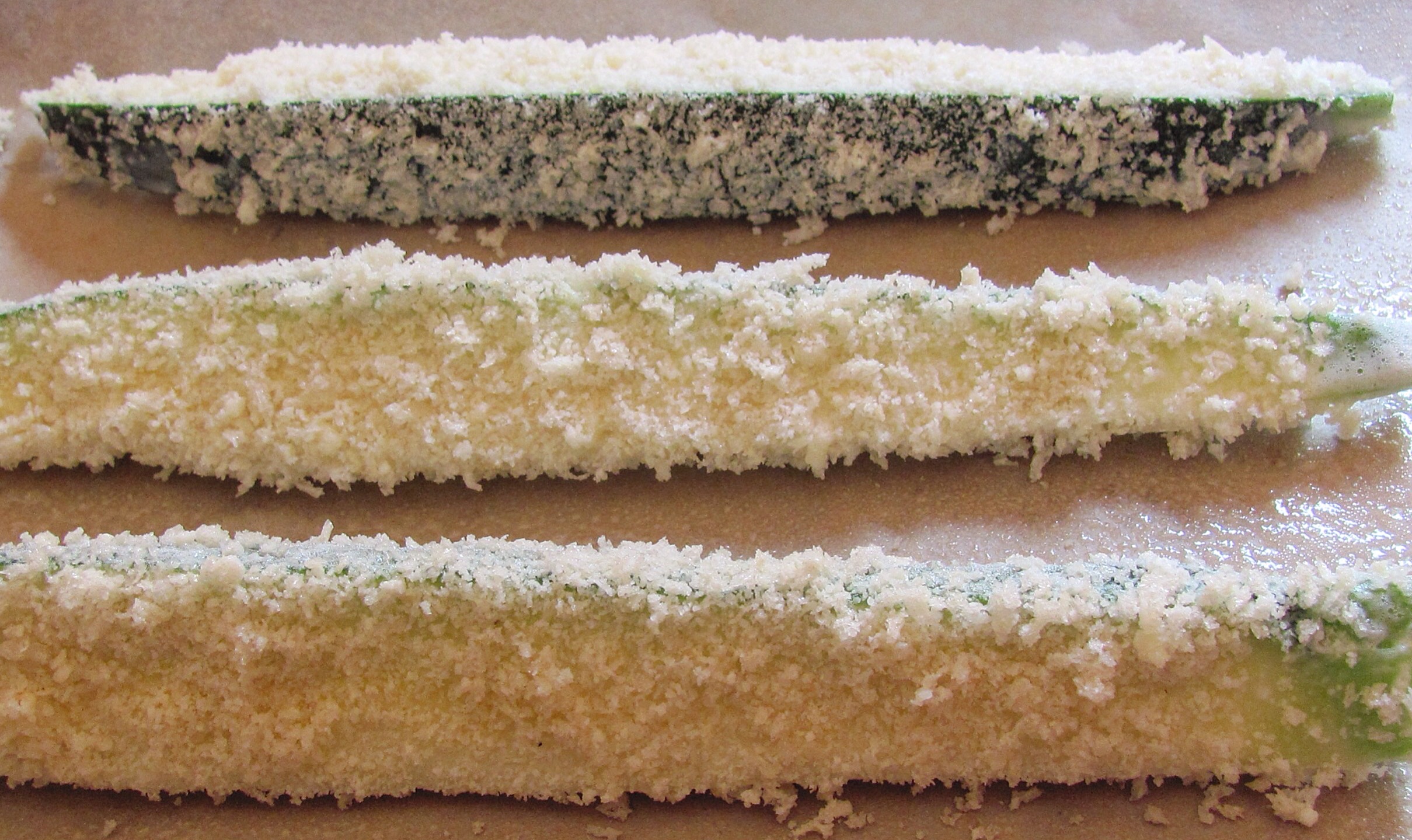 Dunk all the zucchini pieces in the buttermilk mixture. Roll them around so they get fully coated. Then, working with one at a time, dredge them in the cheese crumbs. Pat the crumbs on so they stick, then place the coated pieces on the parchment lined sheet. Now spray all the coated pieces with the cooking spray. This will help them brown.
