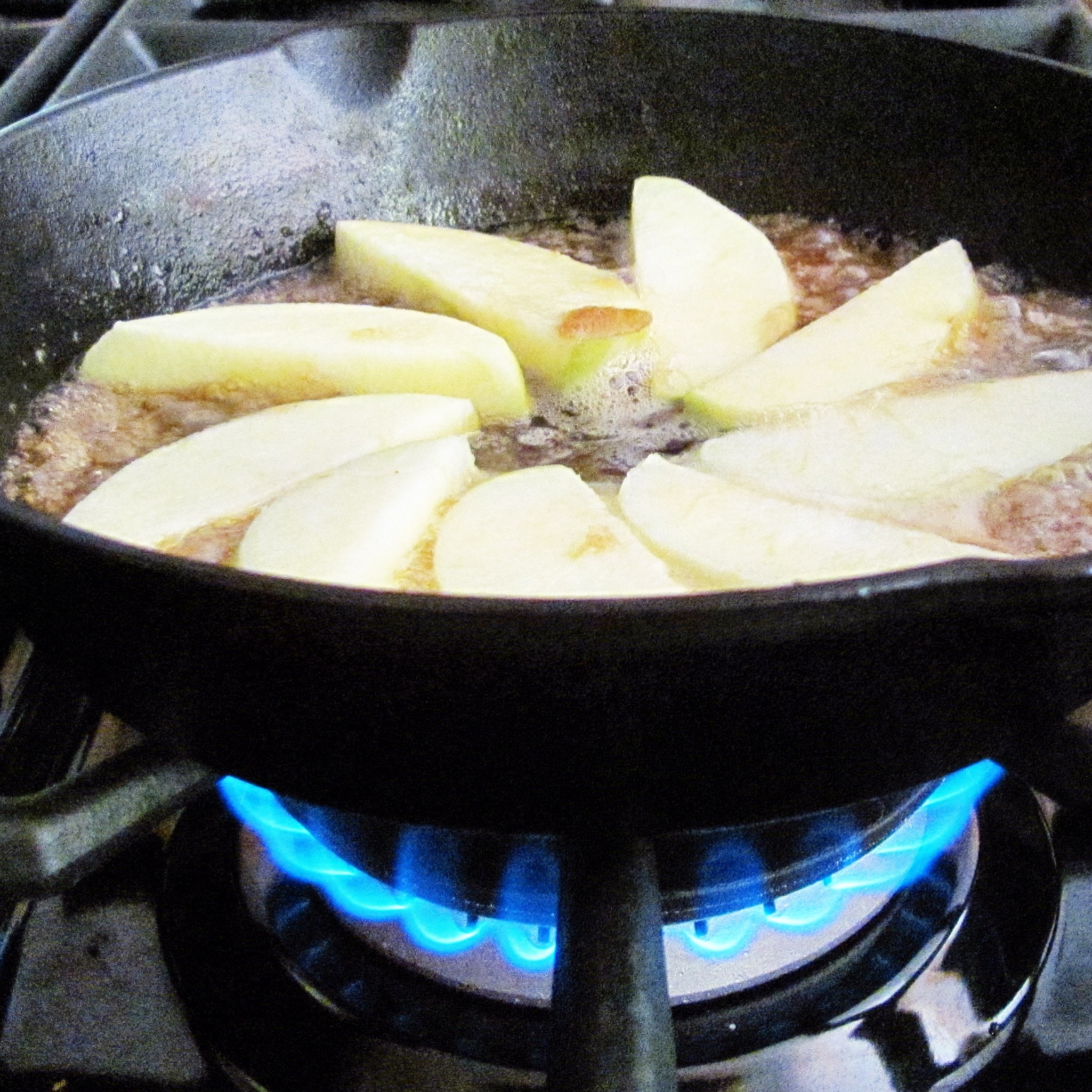 Preheat the oven to 375°. Heat a 6.5 inch cast iron skillet over medium high heat and add the butter. When the butter begins to melt, add the sugar and stir. When the mixture begins to bubble, place the apple slices in a spoke pattern in the bottom of the pan. Sprinkle in a little salt.