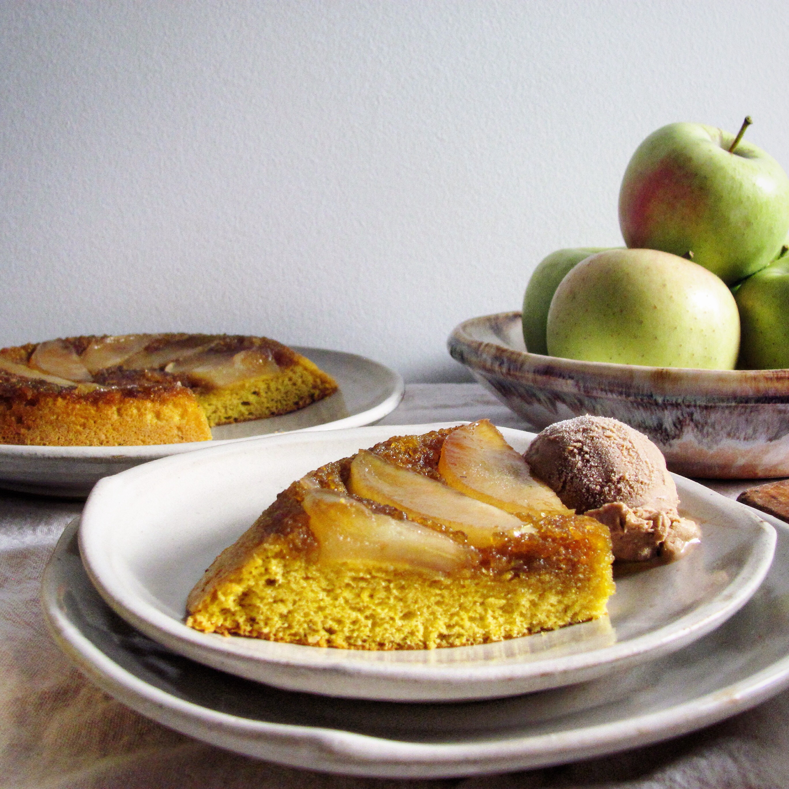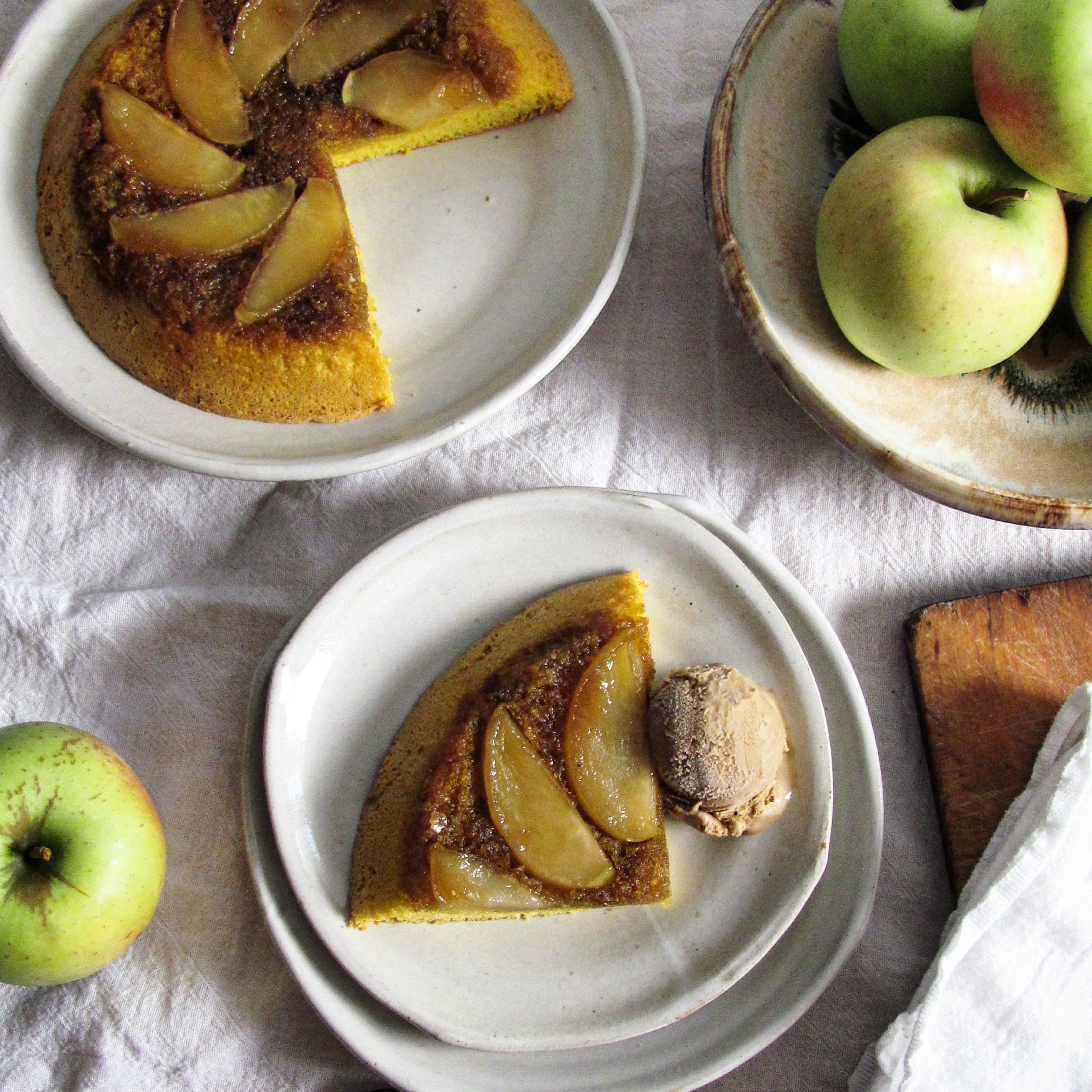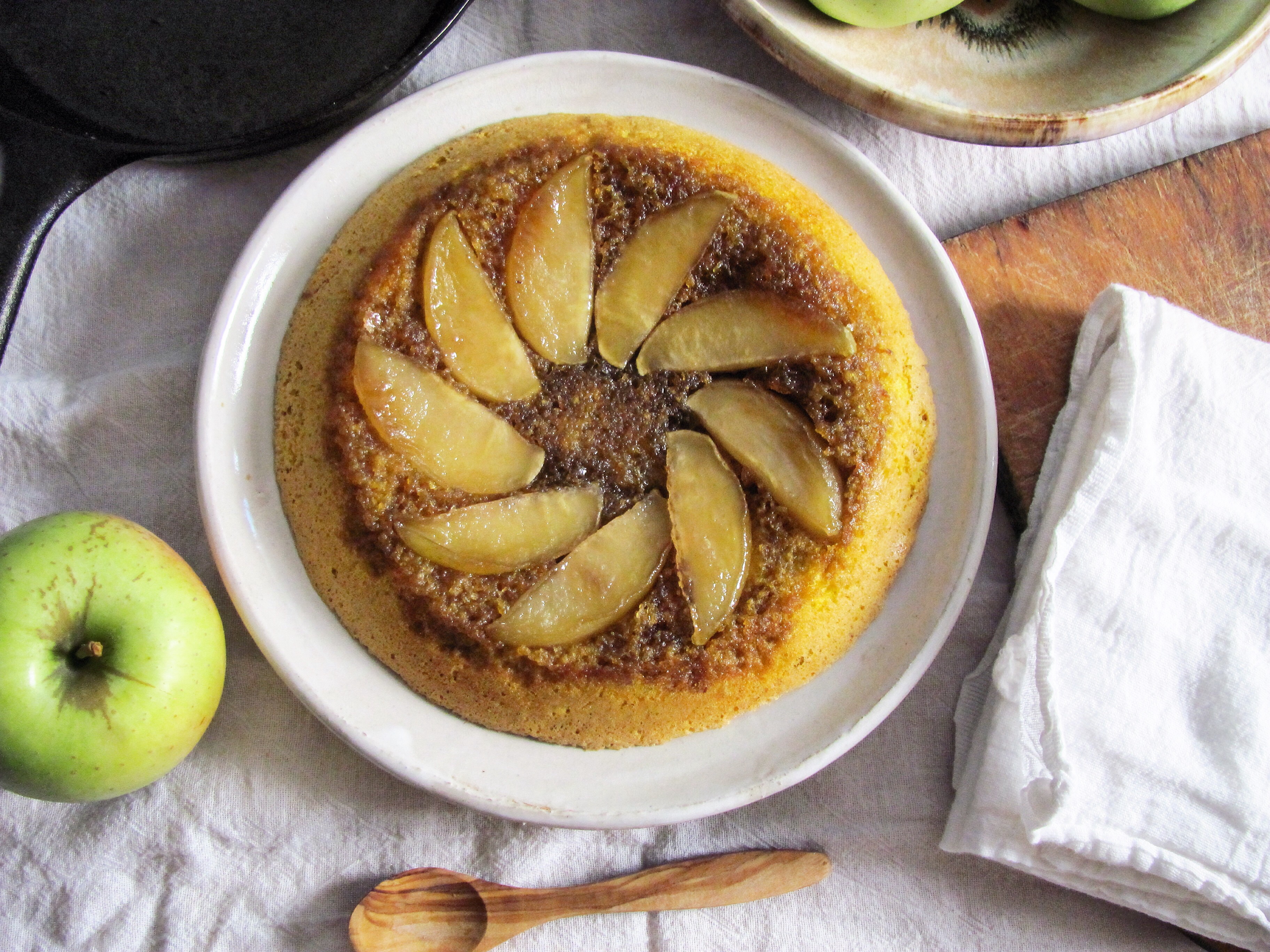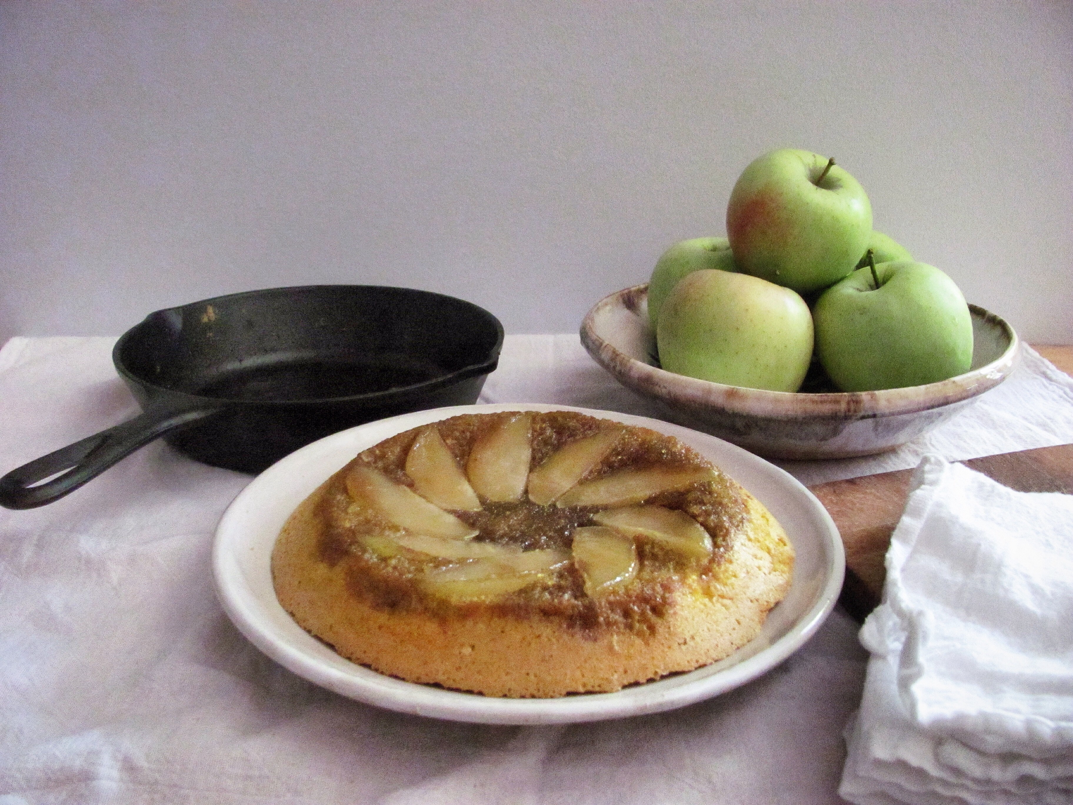 Let cool for 10 minutes. Run a paring knife around the edge of the cake. Place a plate over the skillet. If the handle is still hot, use a pot holder. Take a deep breath. Quickly and confidently, invert the skillet and plate together in one swift motion. Take another breath and remove the skillet. If there are any bits of apple or caramel still in the skillet, use the rubber spatula to spruce up the situation.