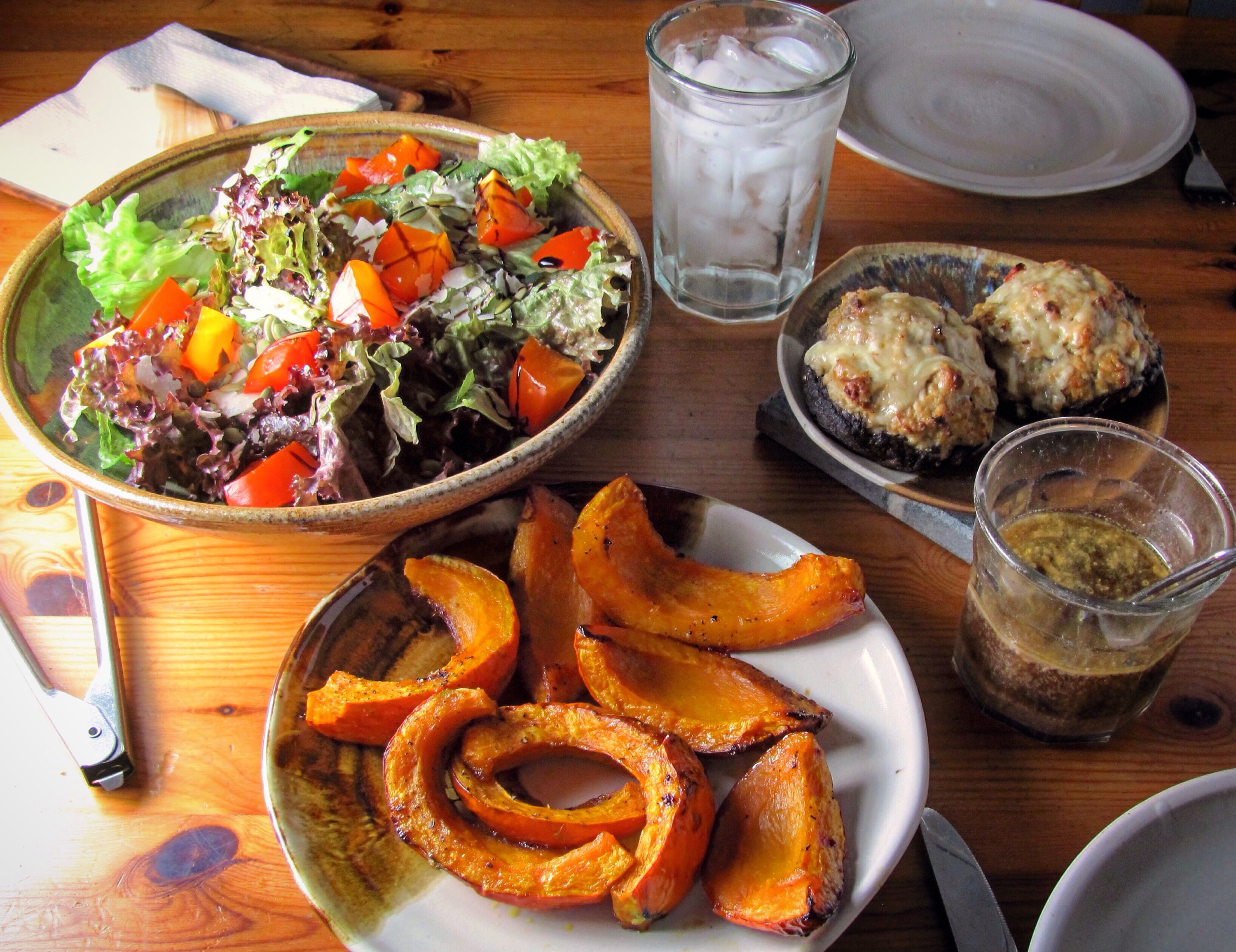 We took the leftovers home since they were leaving. Tonight, I made a salad with persimmons, parm, and pumpkin seeds. A beautiful, bright orange kuri squash got cut into rough chunks and roasted with a bit of walnut oil and sea salt. The mushrooms throw off liquid as they cook; it mixes with the bits of cheese that fall on the pan and together, this ugly mixture, warm, forms a sauce that is the essence of umami. Great on the mushrooms themselves, but also on the salad and squash.